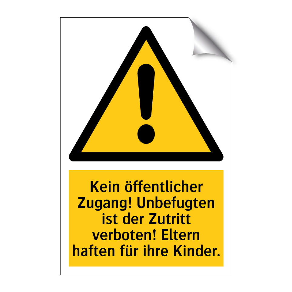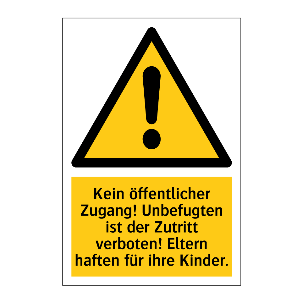 Diese Warnschild ist ideal, um unbefugten Zutritt zu verhindern und die Sicherheit in bestimmten Bereichen zu gewährleisten. Mit ihrer auffälligen gelben Hintergrundfarbe und der klaren schwarzen Schrift zieht sie sofort die Aufmerksamkeit auf sich. Diese Warnschilder sind besonders nützlich in Bereichen, die für die Öffentlichkeit nicht zugänglich sind, wie Baustellen, private Grundstücke oder industrielle Anlagen. Sie erinnert Eltern daran, dass sie für ihre Kinder verantwortlich sind, was besonders in gefährlichen Umgebungen wichtig ist. Platzieren Sie diese Warnschild an Eingängen, Zäunen oder anderen strategischen Punkten, um sicherzustellen, dass die Botschaft klar und deutlich vermittelt wird.