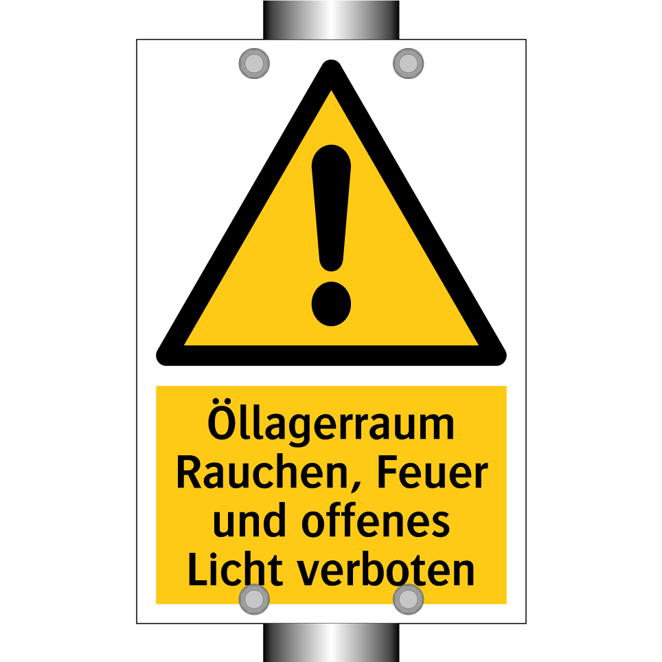 Warnschild mit dem Text Öllagerraum Rauchen, Feuer und offenes Licht verboten