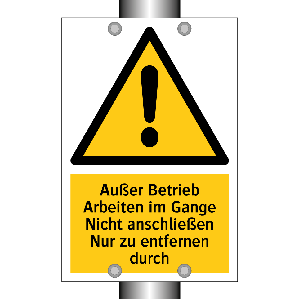 Warnschild mit dem Text Außer Betrieb Arbeiten im Gange Nicht anschließen Nur zu entfernen durch