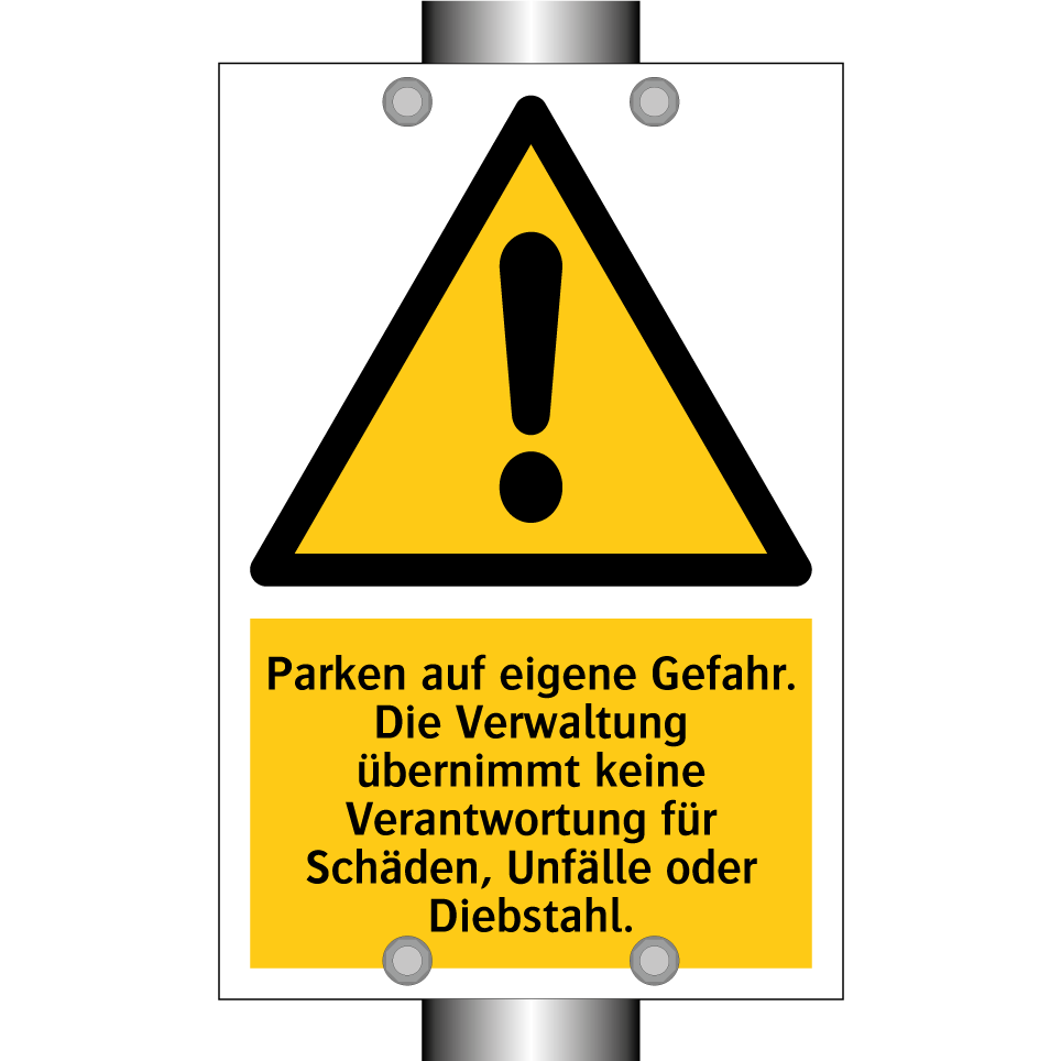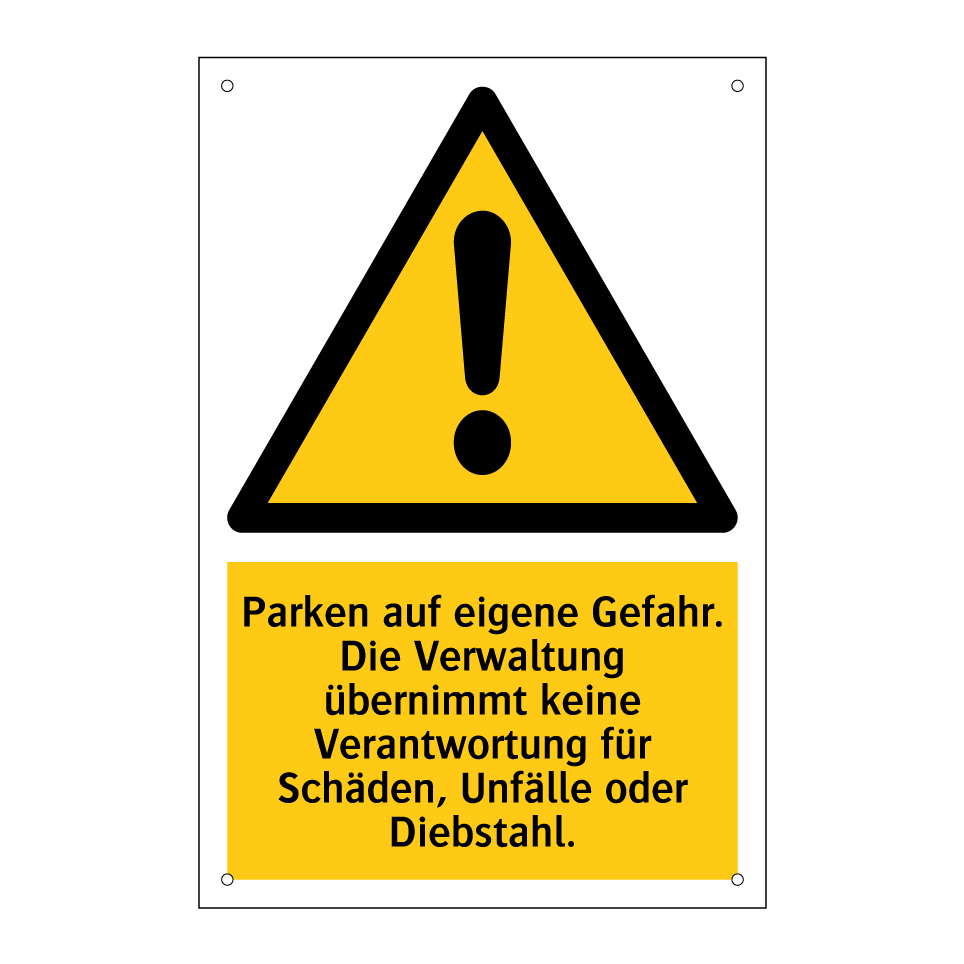 Warnschild mit dem Text Parken auf eigene Gefahr. Die Verwaltung übernimmt keine Verantwortung für Schäden, Unfälle oder Diebstahl.