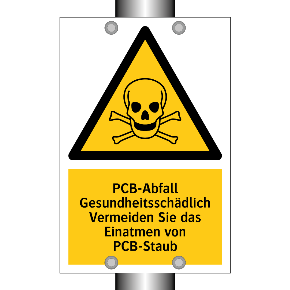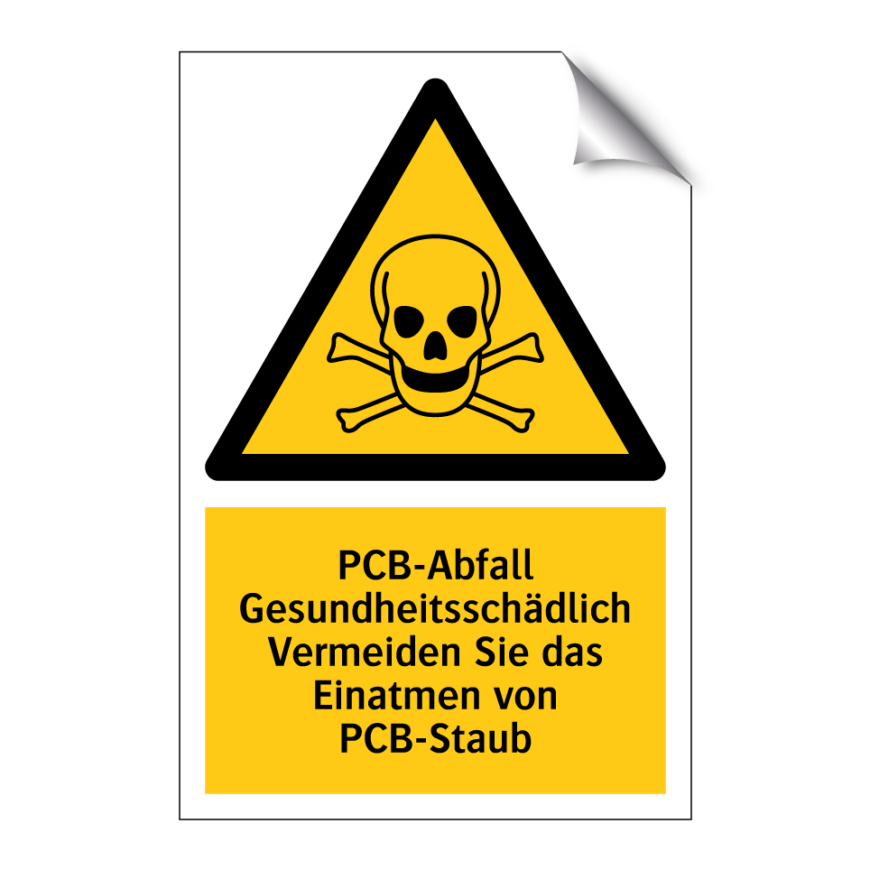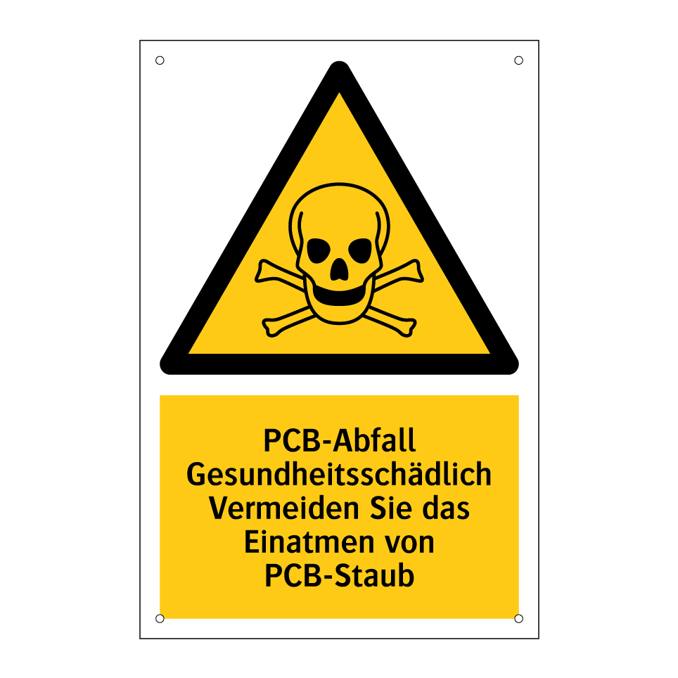 Warnschild mit dem Text PCB-Abfall Gesundheitsschädlich Vermeiden Sie das Einatmen von PCB-Staub