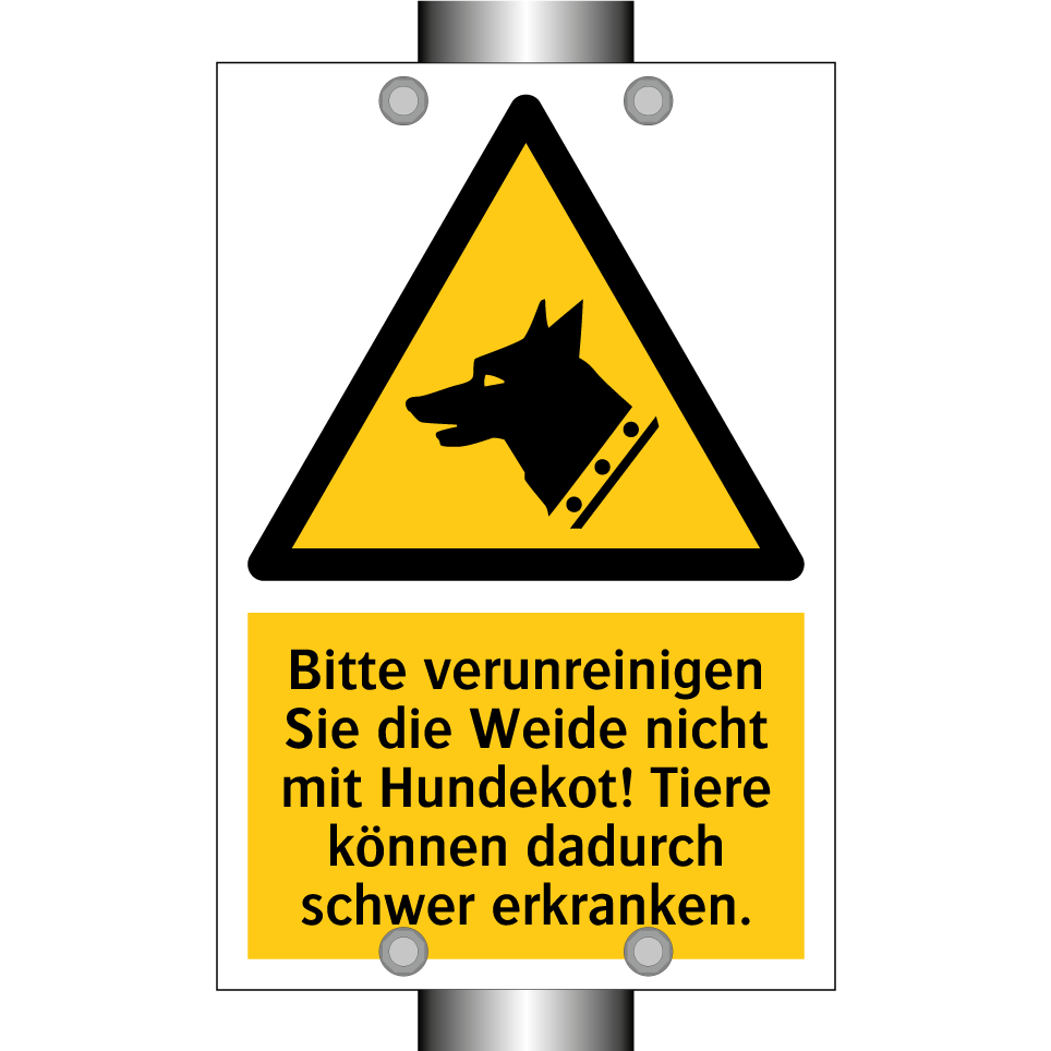 Warnschild mit dem Text Bitte verunreinigen Sie die Weide nicht mit Hundekot! Tiere können dadurch schwer erkranken.