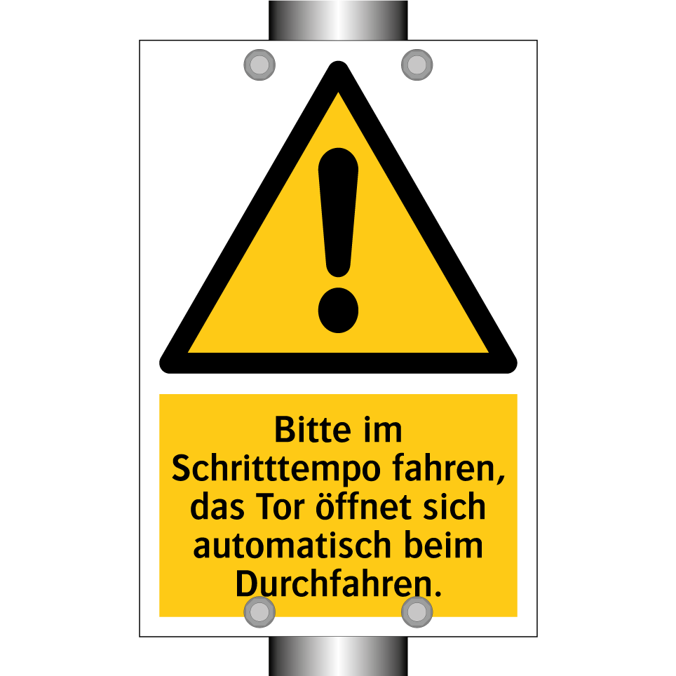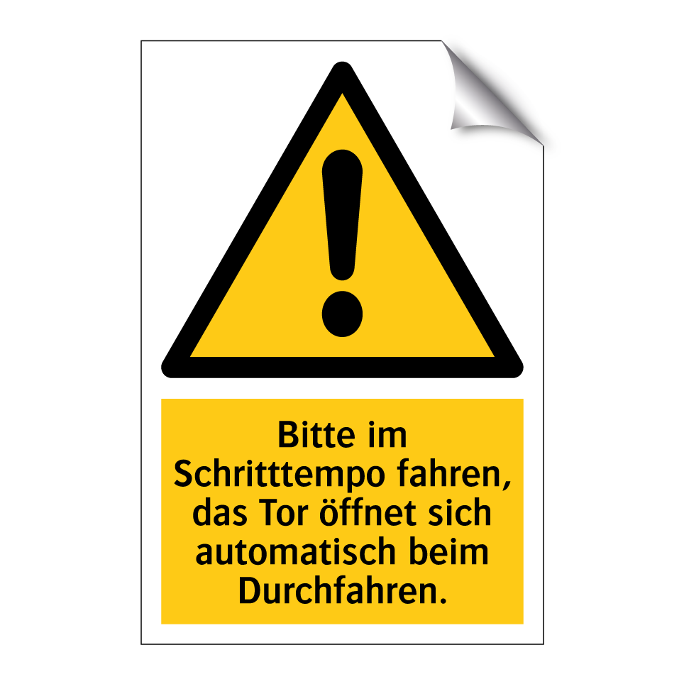Warnschild mit dem Text Bitte im Schritttempo fahren, das Tor öffnet sich automatisch beim Durchfahren.
