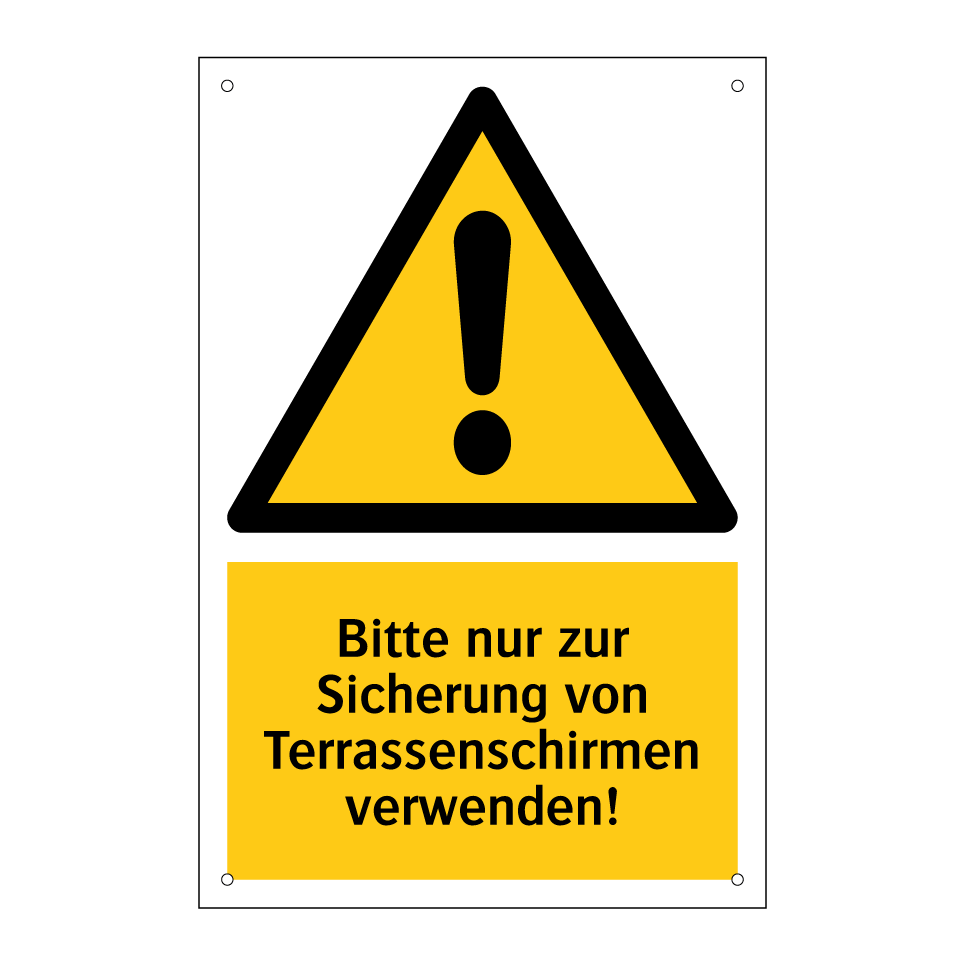 Warnschild mit dem Text Bitte nur zur Sicherung von Terrassenschirmen verwenden!