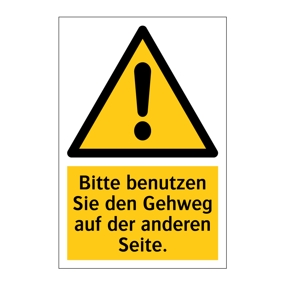 Warnschild mit dem Text Bitte benutzen Sie den Gehweg auf der anderen Seite.