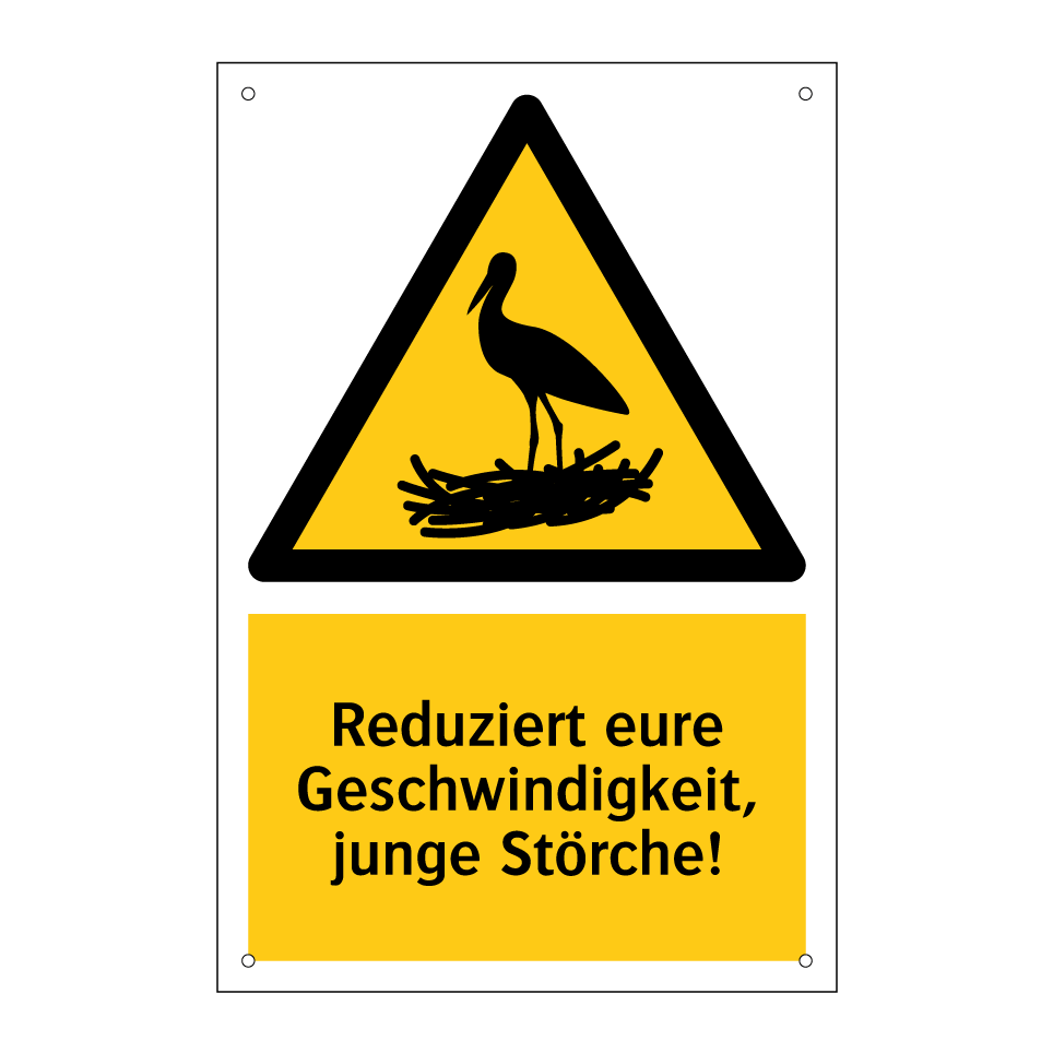Warnschild mit dem Text Reduziert eure Geschwindigkeit, junge Störche!