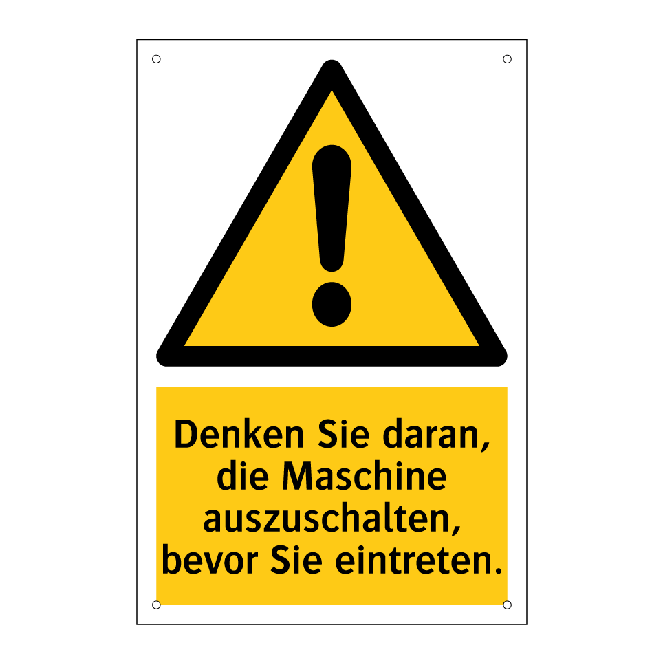 Warnschild mit dem Text Denken Sie daran, die Maschine auszuschalten, bevor Sie eintreten.