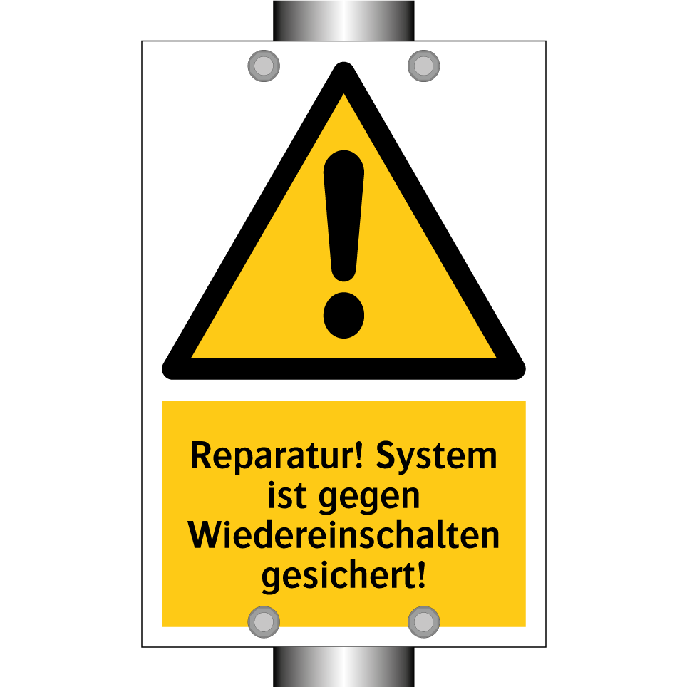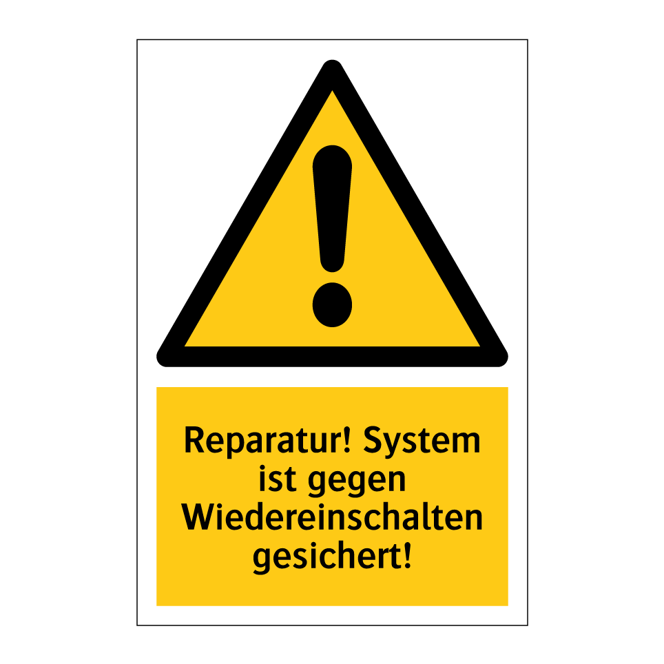 Warnschild mit dem Text Reparatur! System ist gegen Wiedereinschalten gesichert!
