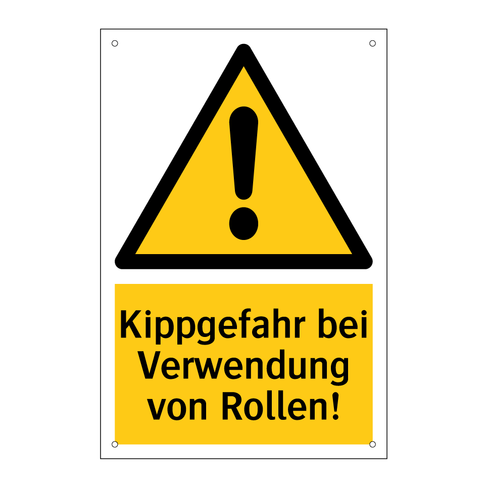 Warnschild mit dem Text Kippgefahr bei Verwendung von Rollen!