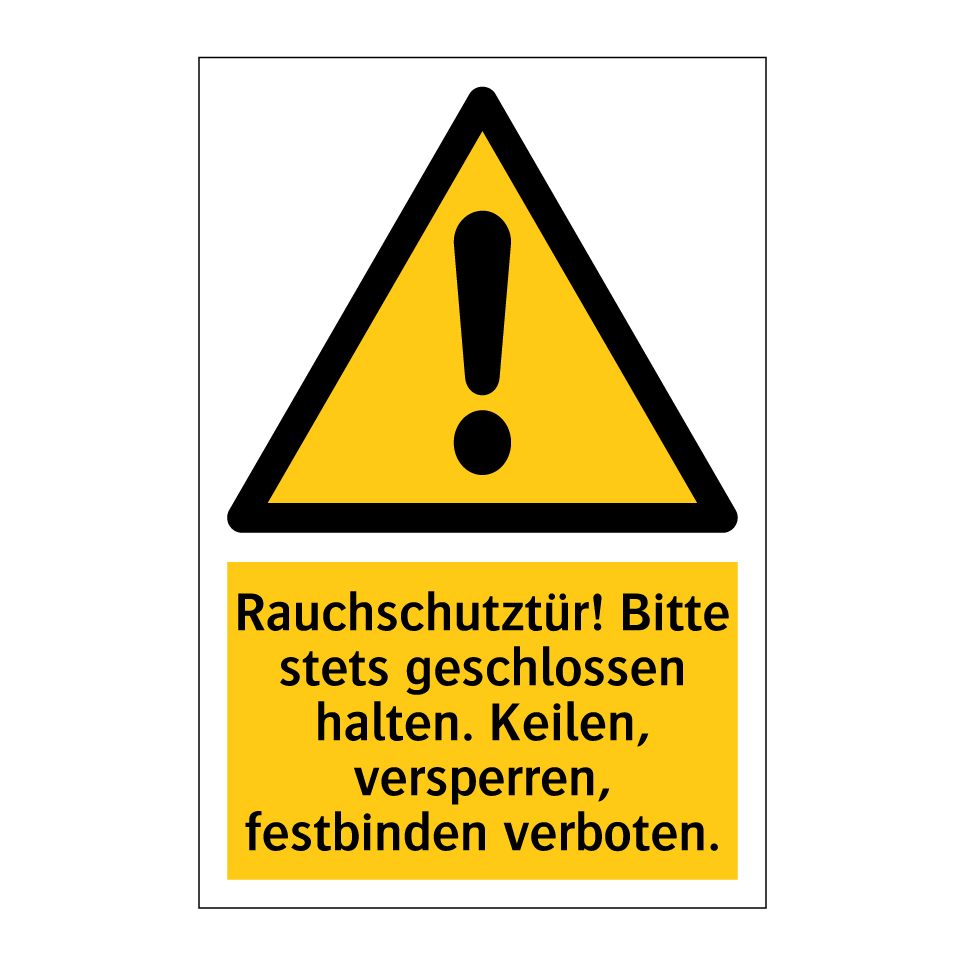 Warnschild mit dem Text Rauchschutztür! Bitte stets geschlossen halten. Keilen, versperren, festbinden verboten.
