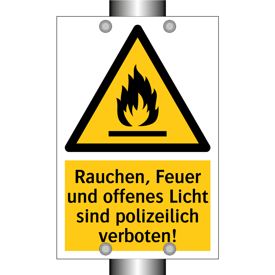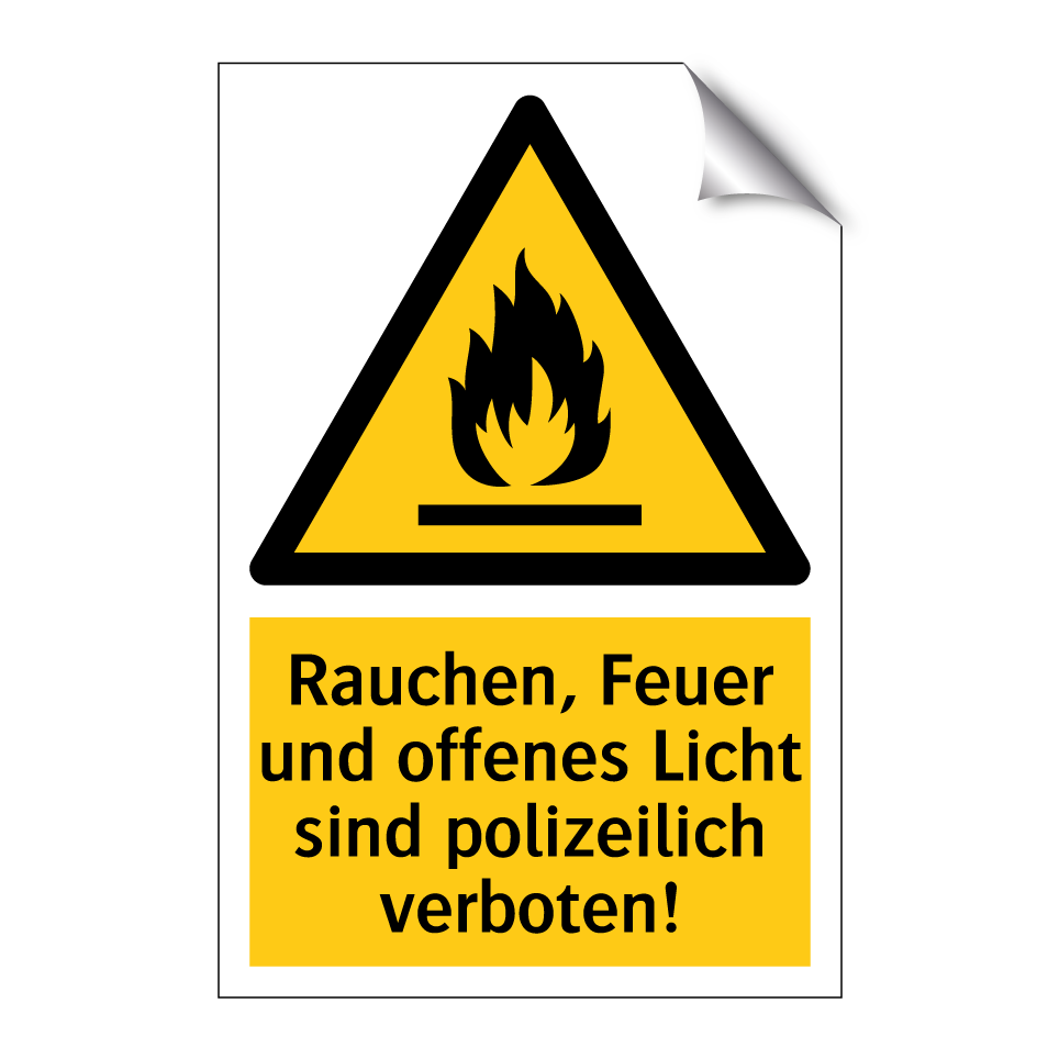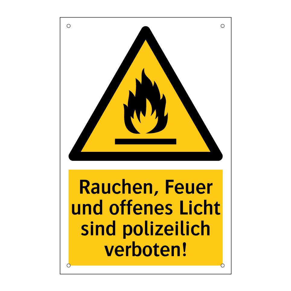 Warnschild mit dem Text Rauchen, Feuer und offenes Licht sind polizeilich verboten!