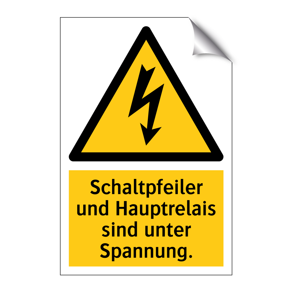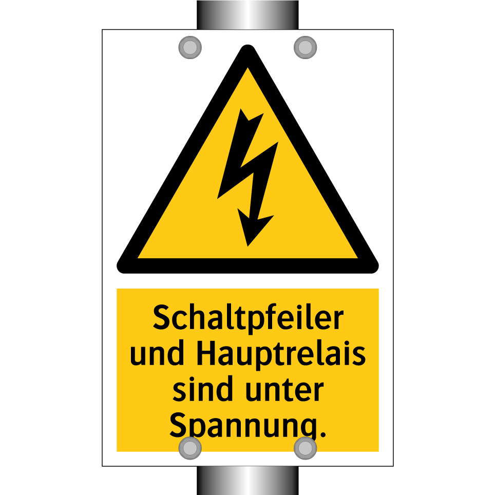 Warnschild mit dem Text Schaltpfeiler und Hauptrelais sind unter Spannung.
