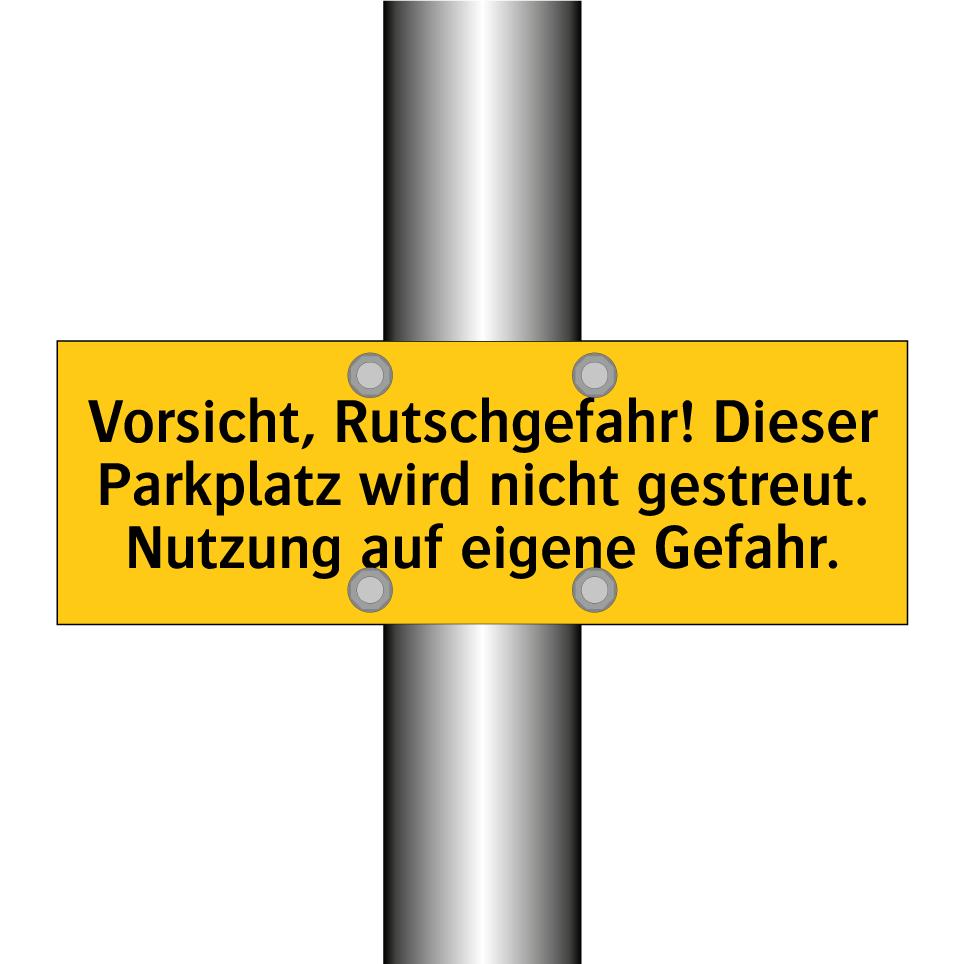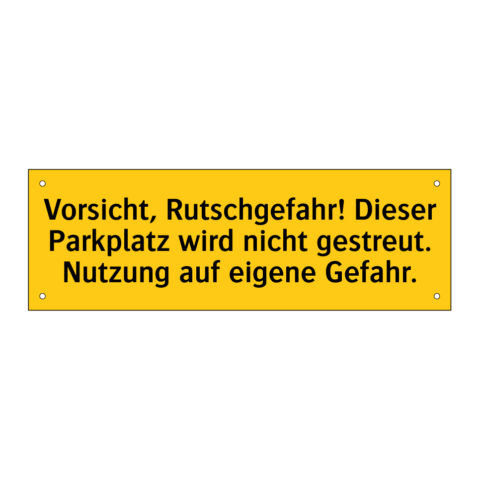 Warnschild mit dem Text Vorsicht, Rutschgefahr! Dieser Parkplatz wird nicht gestreut. Nutzung auf eigene Gefahr.