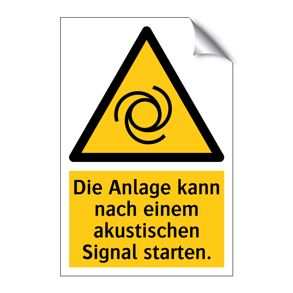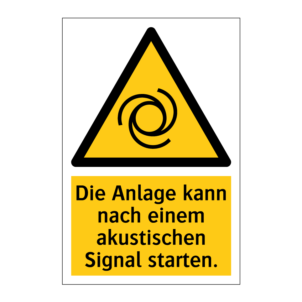Warnschild mit dem Text Die Anlage kann nach einem akustischen Signal starten.