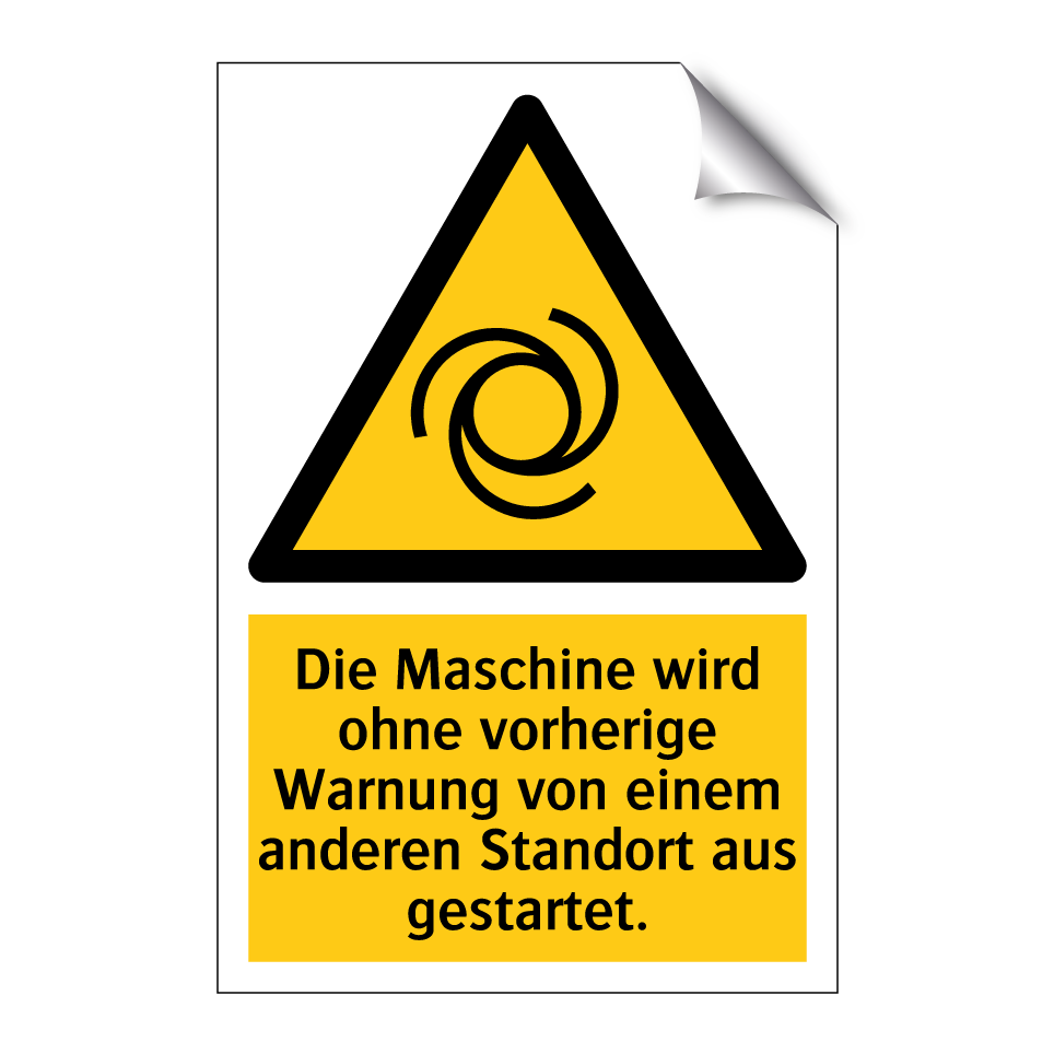 Warnschild mit dem Text Die Maschine wird ohne vorherige Warnung von einem anderen Standort aus gestartet.