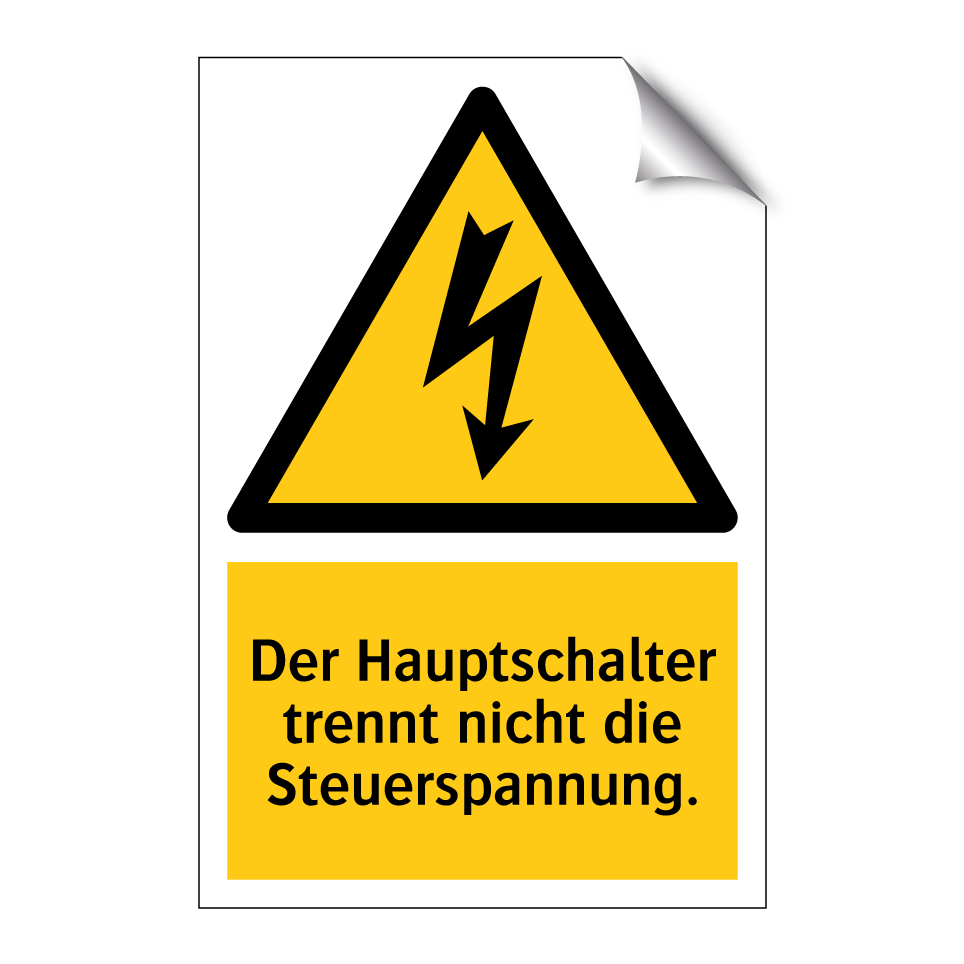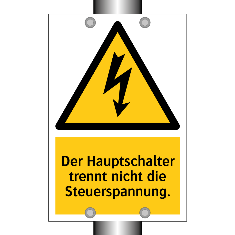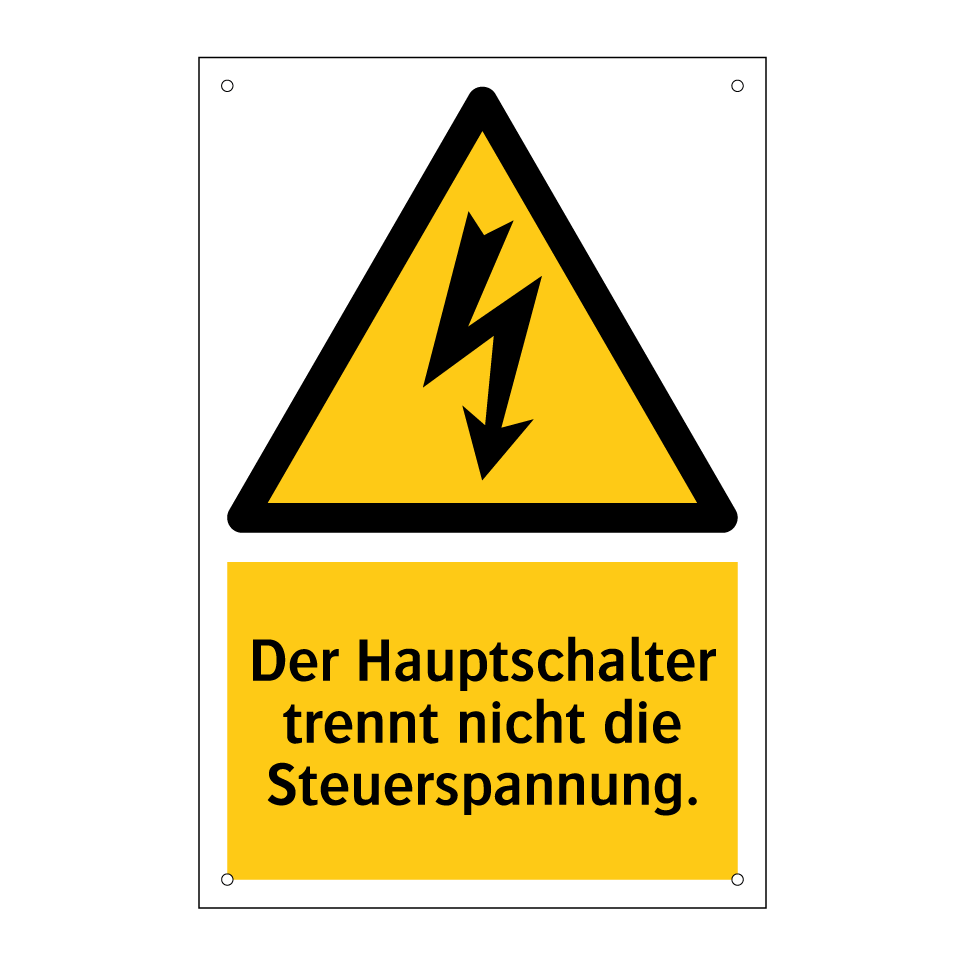 Warnschild mit dem Text Der Hauptschalter trennt nicht die Steuerspannung.
