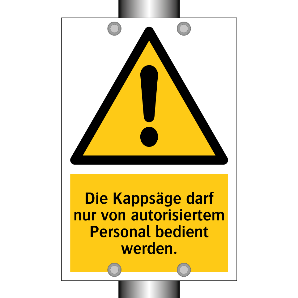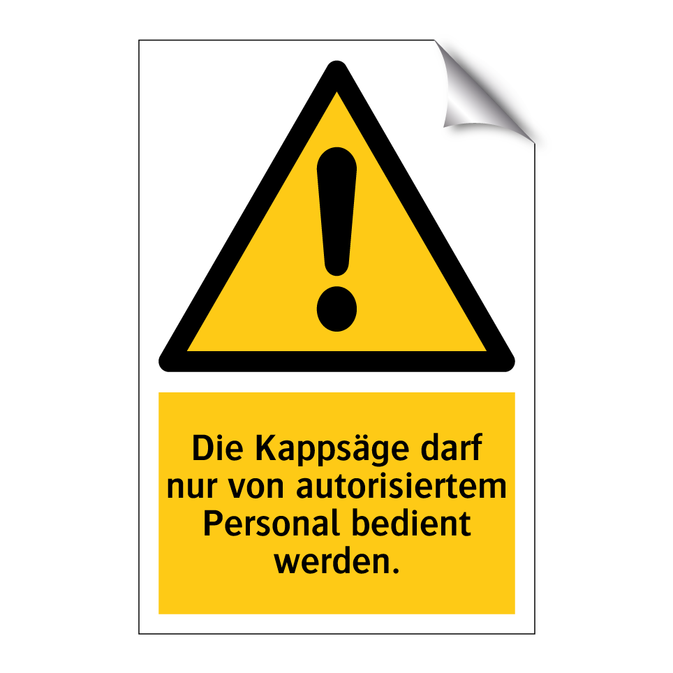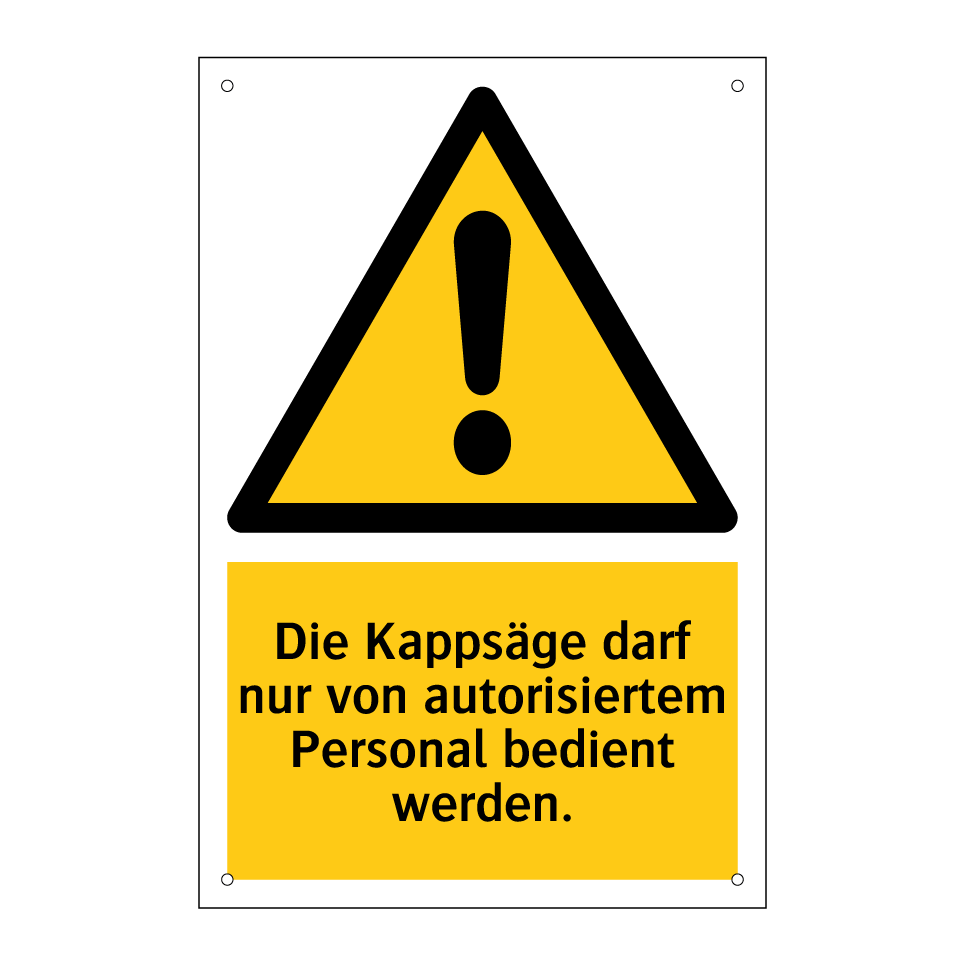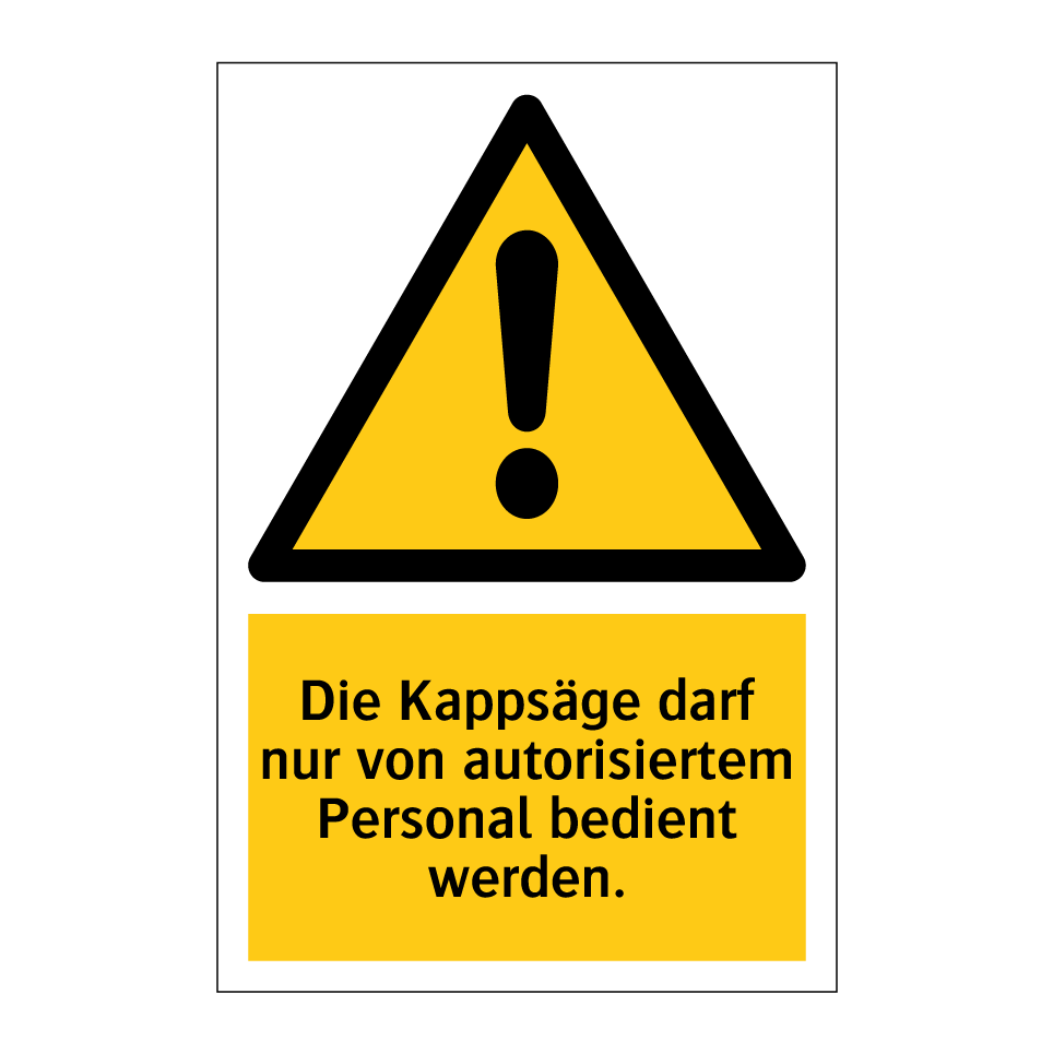 Warnschild mit dem Text Die Kappsäge darf nur von autorisiertem Personal bedient werden.