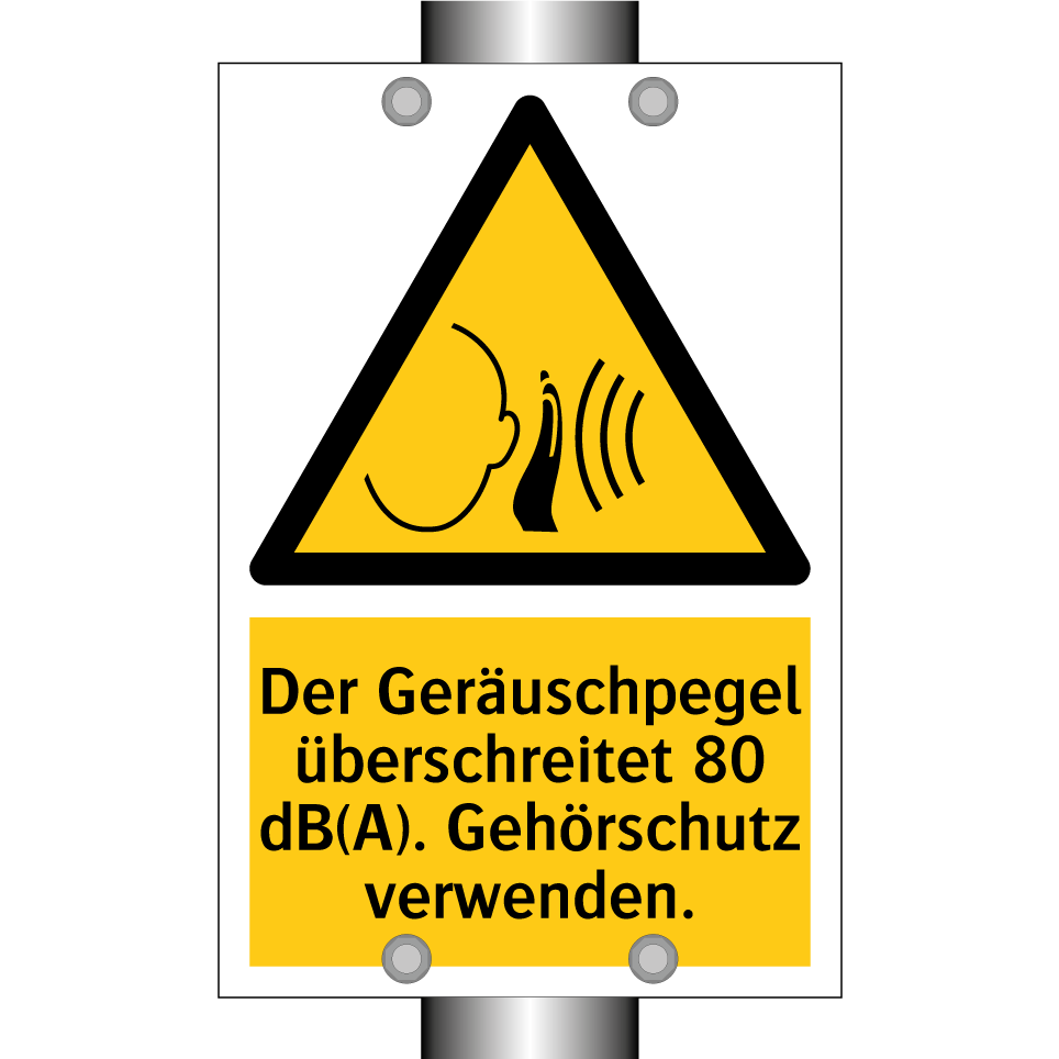 Warnschild mit dem Text Der Geräuschpegel überschreitet 80 dB(A). Gehörschutz verwenden.