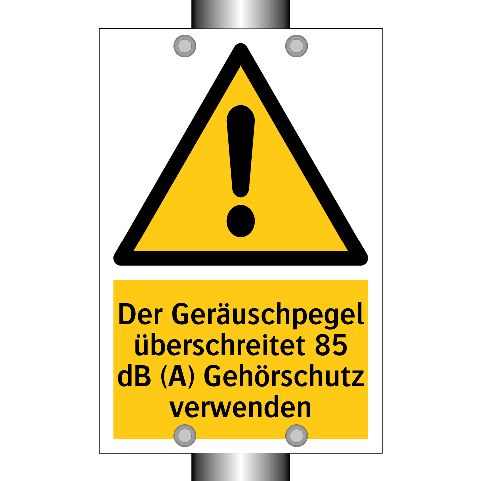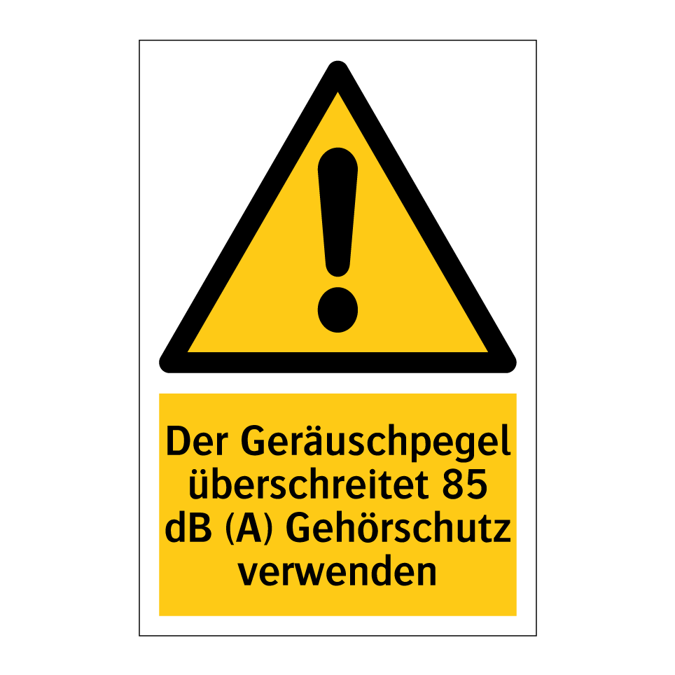 Warnschild mit dem Text Der Geräuschpegel überschreitet 85 dB (A) Gehörschutz verwenden