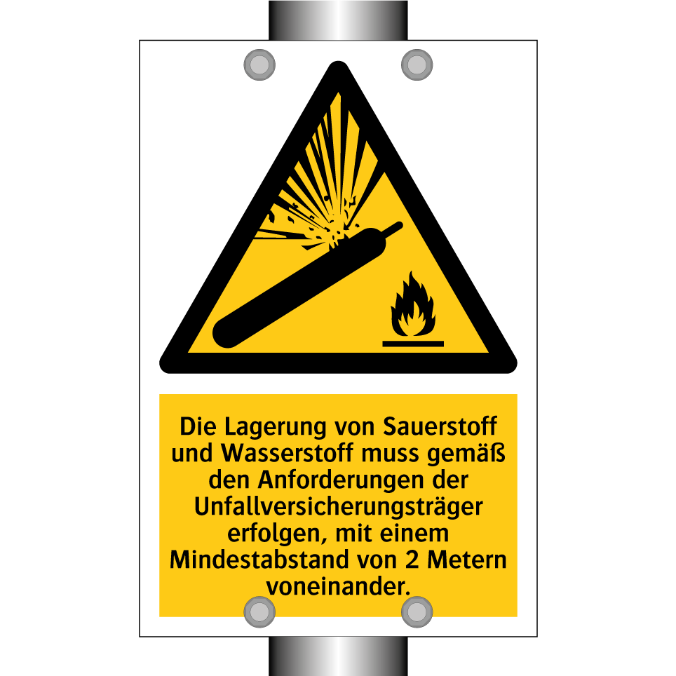Warnschild mit dem Text Die Lagerung von Sauerstoff und Wasserstoff muss gemäß den Anforderungen der Unfallversicherungsträger erfolgen, mit einem Mindestabstand von 2 Metern voneinander.