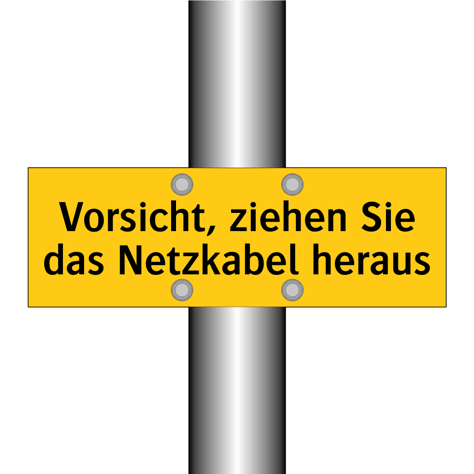 Warnschild mit dem Text Vorsicht, ziehen Sie das Netzkabel heraus