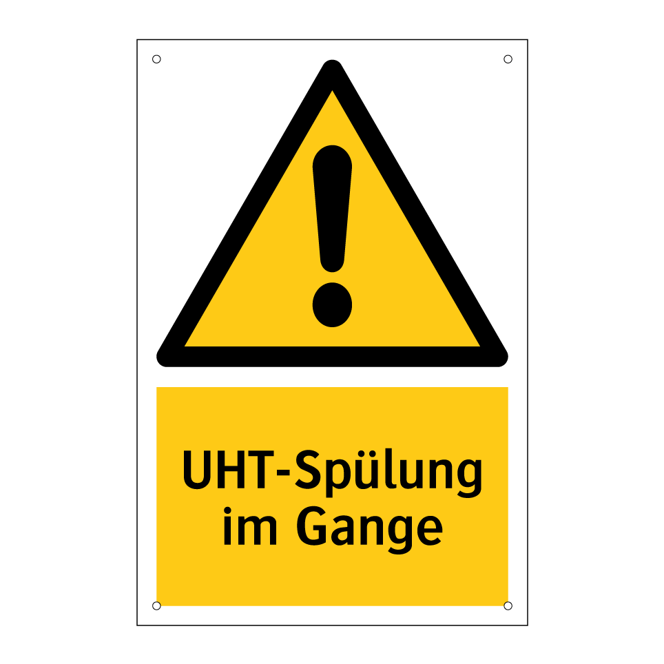 Diese auffällige Warnschild mit gelbem Hintergrund und schwarzem Text ist ideal für den Einsatz in industriellen Umgebungen, in denen Vorsicht geboten ist. Die klare Symbolik und die prägnante Botschaft machen es unverzichtbar in Bereichen, in denen UHT-Reinigungsprozesse stattfinden. Platzieren Sie das Warnschild an gut sichtbaren Stellen wie Eingängen zu Produktionsbereichen, um Mitarbeiter und Besucher auf laufende Reinigungsarbeiten aufmerksam zu machen. Es eignet sich hervorragend für Molkereien, Lebensmittelverarbeitungsbetriebe und andere Einrichtungen, in denen Hygiene von größter Bedeutung ist. Durch die strategische Platzierung dieser Warnschilder wird die Sicherheit erhöht und das Bewusstsein für potenzielle Gefahren geschärft.