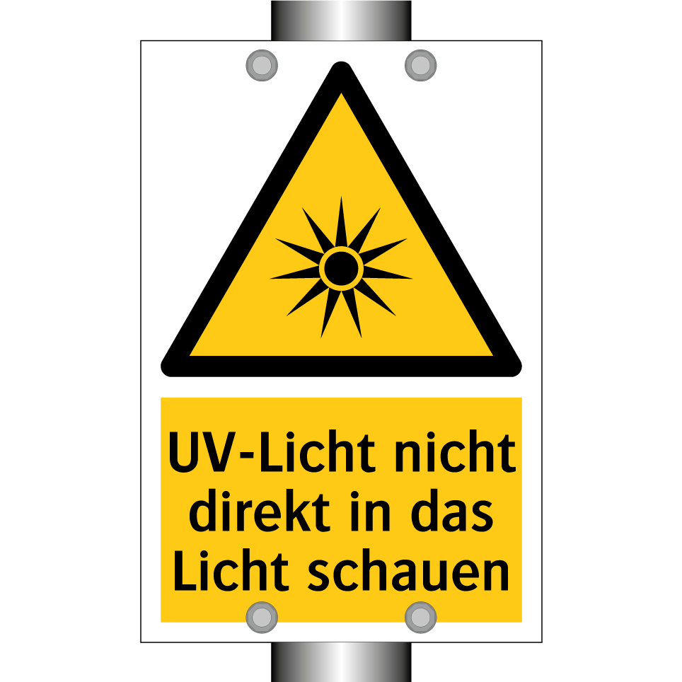 Warnschild mit dem Text UV-Licht nicht direkt in das Licht schauen