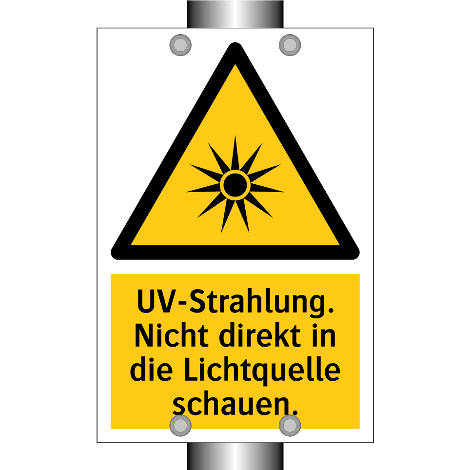 Warnschild mit dem Text UV-Strahlung. Nicht direkt in die Lichtquelle schauen.