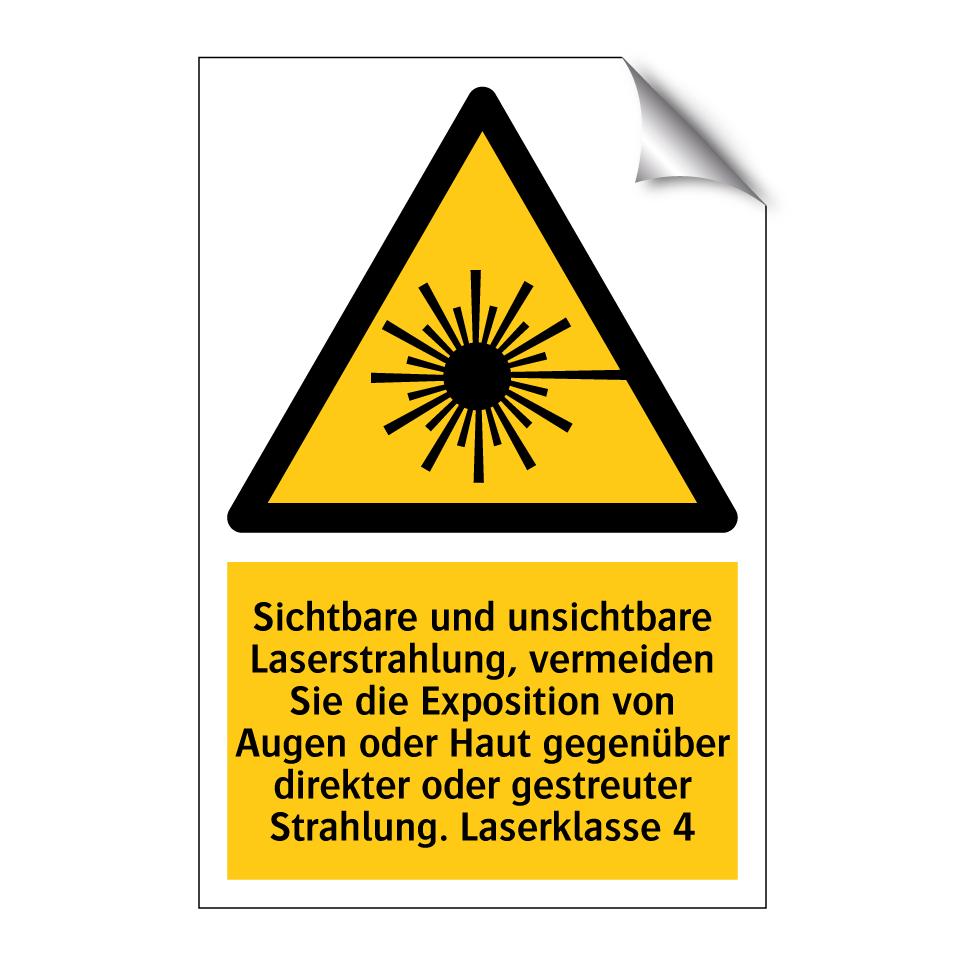 Warnschild mit dem Text Sichtbare und unsichtbare Laserstrahlung, vermeiden Sie die Exposition von Augen oder Haut gegenüber direkter oder gestreuter Strahlung. Laserklasse 4