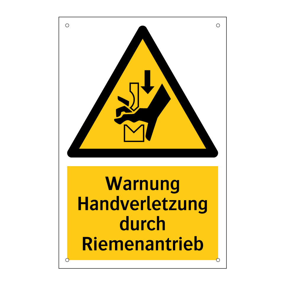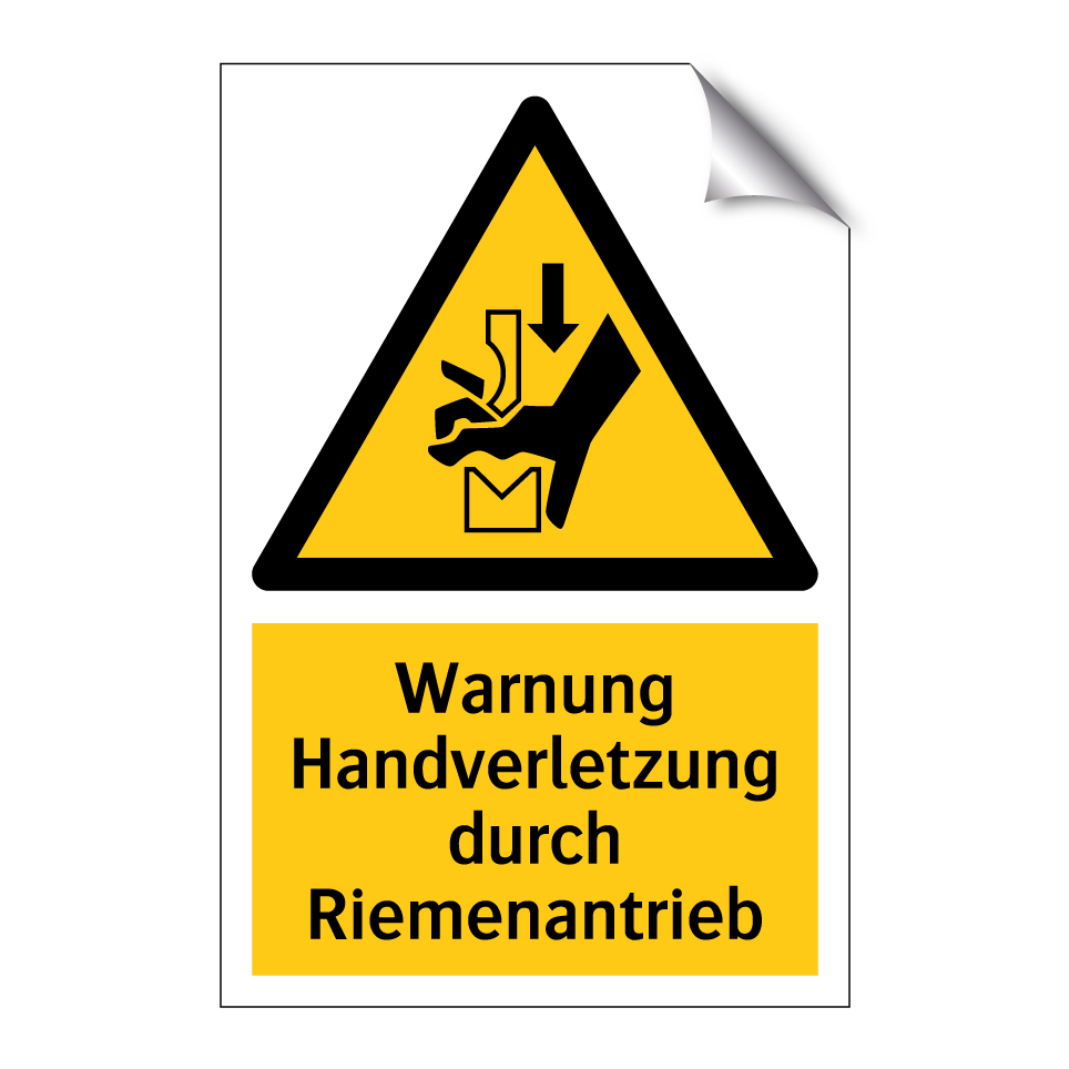 Warnschild mit dem Text Warnung Handverletzung durch Riemenantrieb