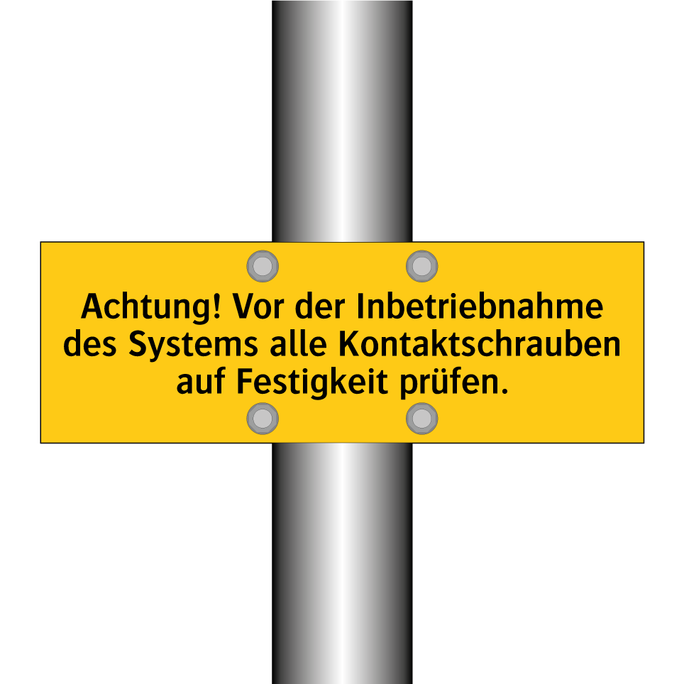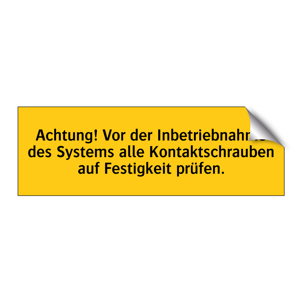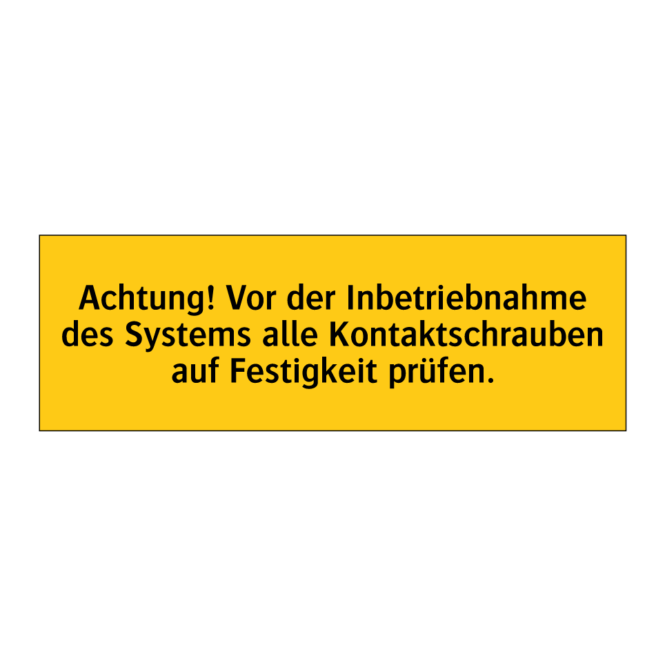 Warnschild mit dem Text Achtung! Vor der Inbetriebnahme des Systems alle Kontaktschrauben auf Festigkeit prüfen.