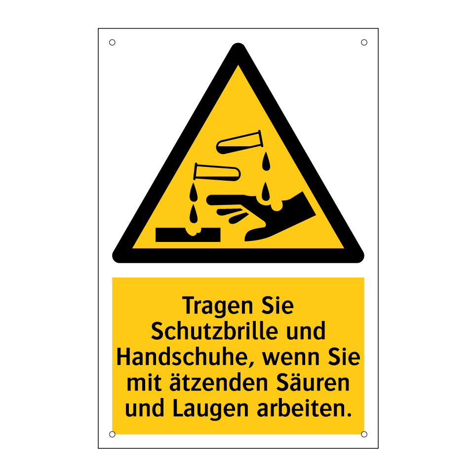 Warnschild mit dem Text Tragen Sie Schutzbrille und Handschuhe, wenn Sie mit ätzenden Säuren und Laugen arbeiten.