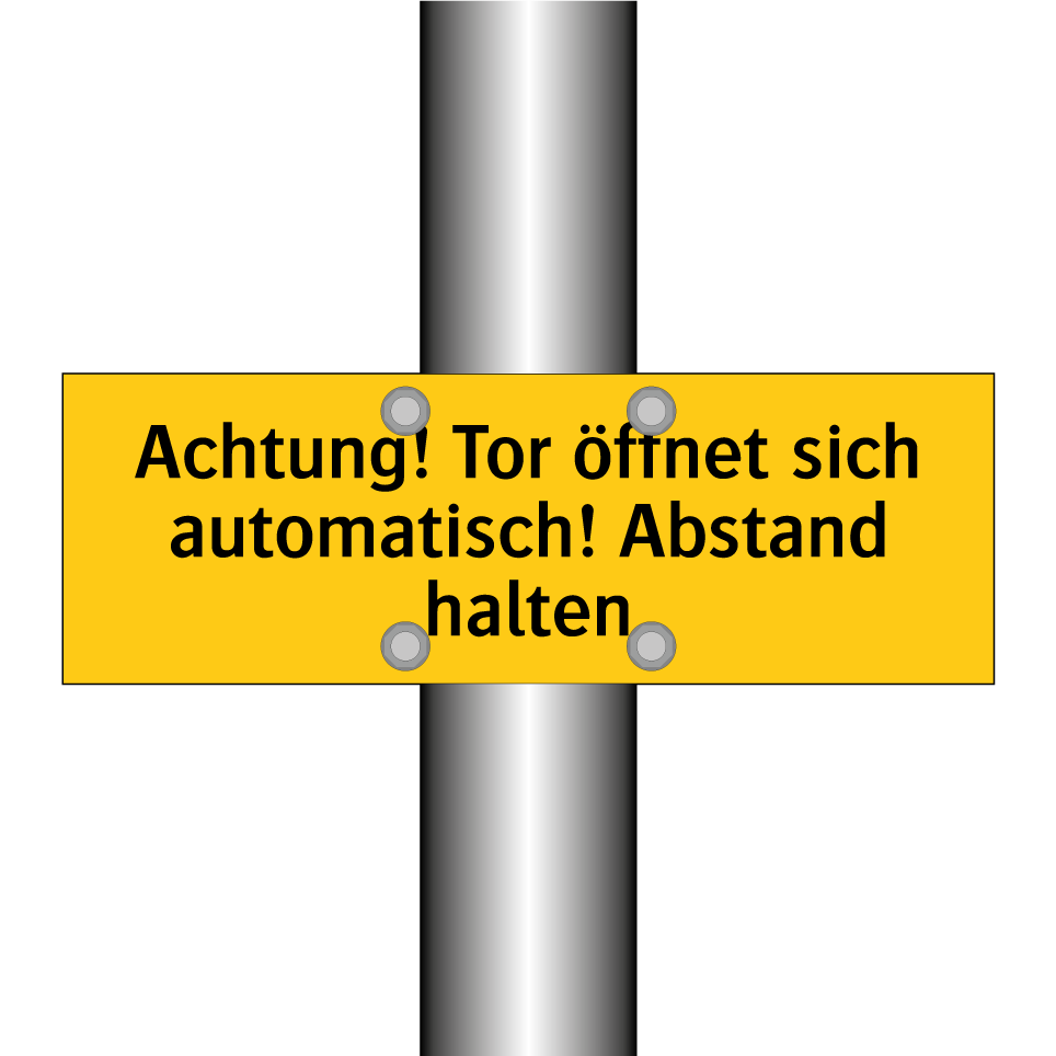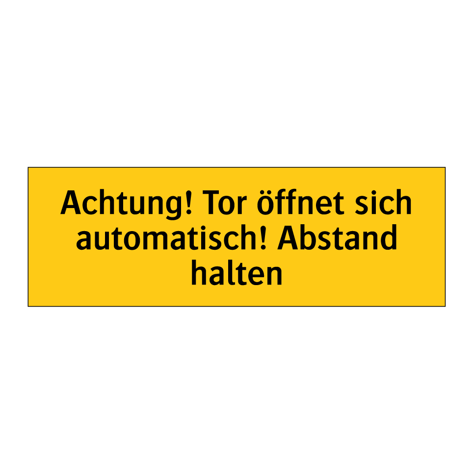 Warnschild mit dem Text Achtung! Tor öffnet sich automatisch! Abstand halten