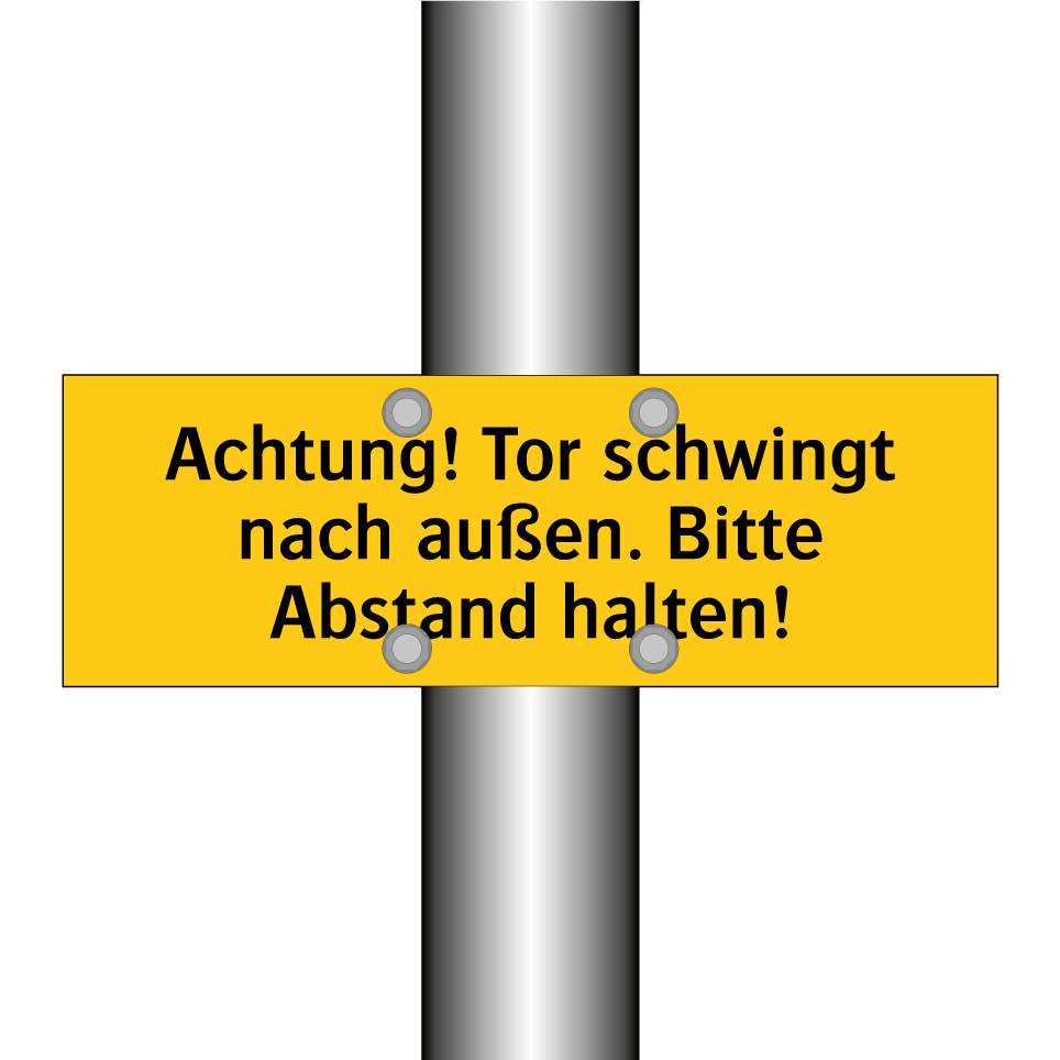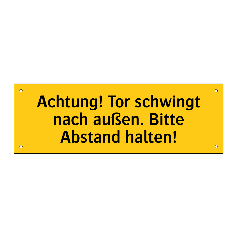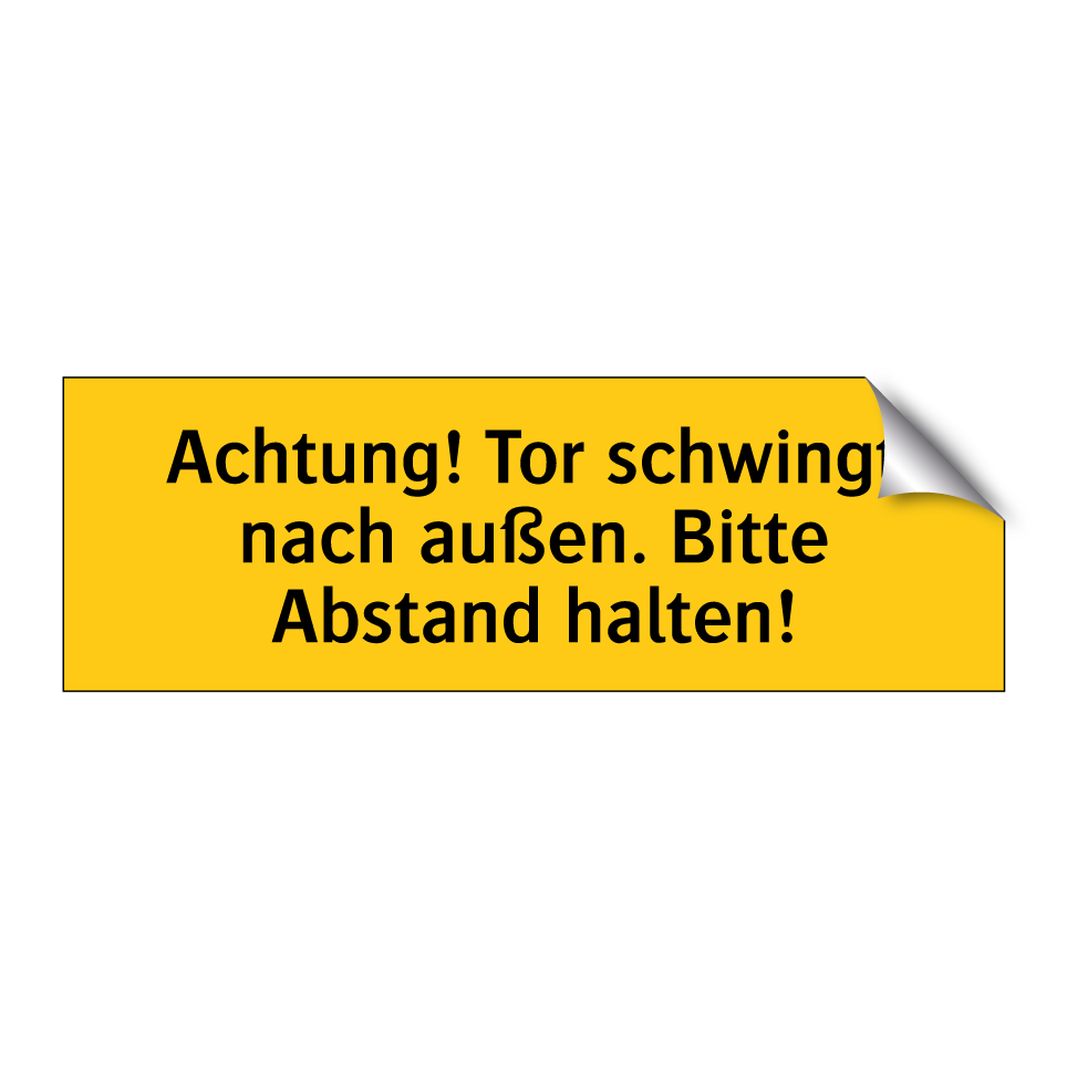 Warnschild mit dem Text Achtung! Tor schwingt nach außen. Bitte Abstand halten!