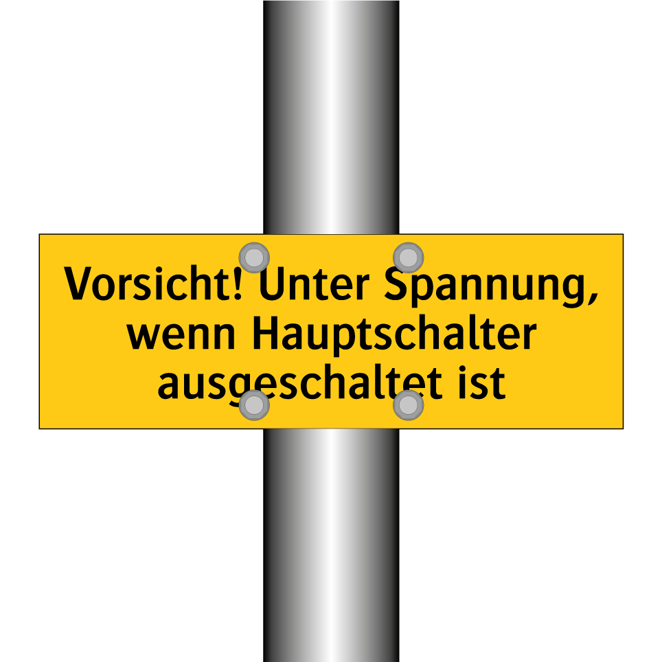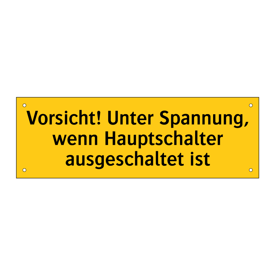 Warnschild mit dem Text Vorsicht! Unter Spannung, wenn Hauptschalter ausgeschaltet ist