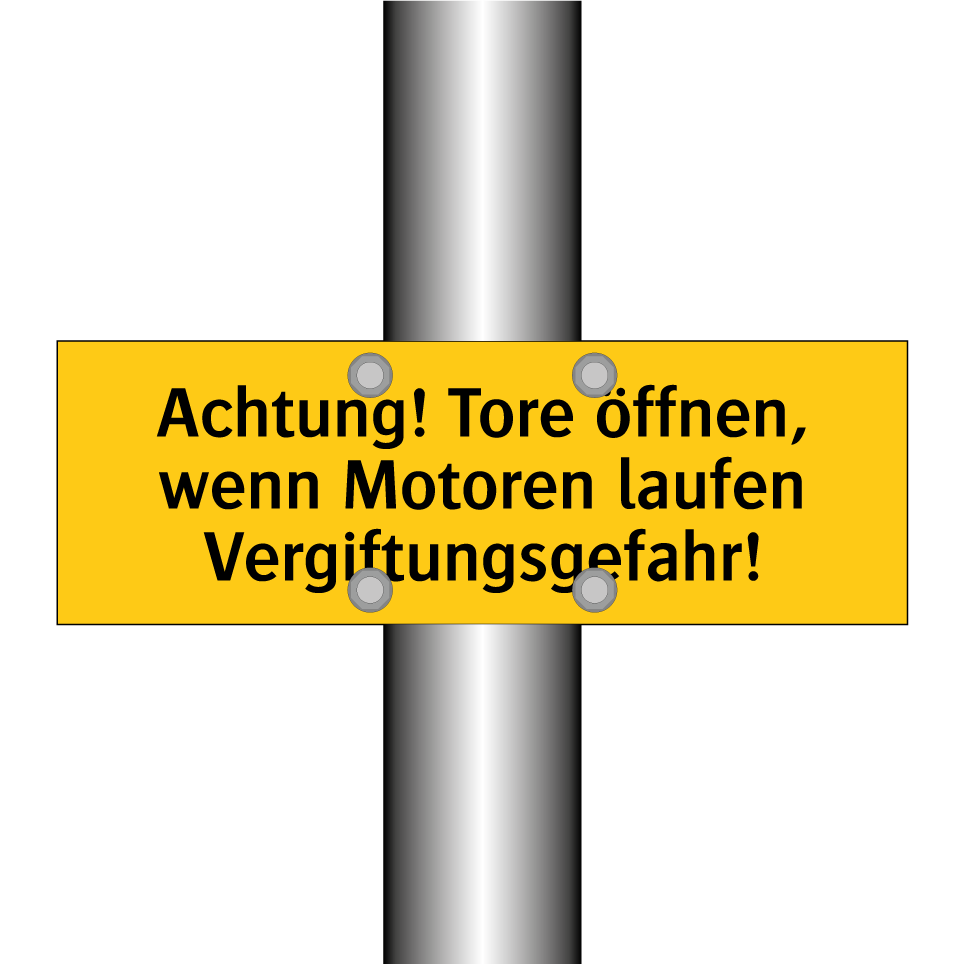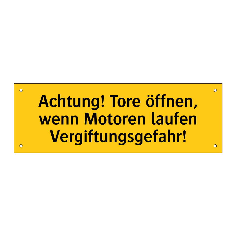 Warnschild mit dem Text Achtung! Tore öffnen, wenn Motoren laufen Vergiftungsgefahr!
