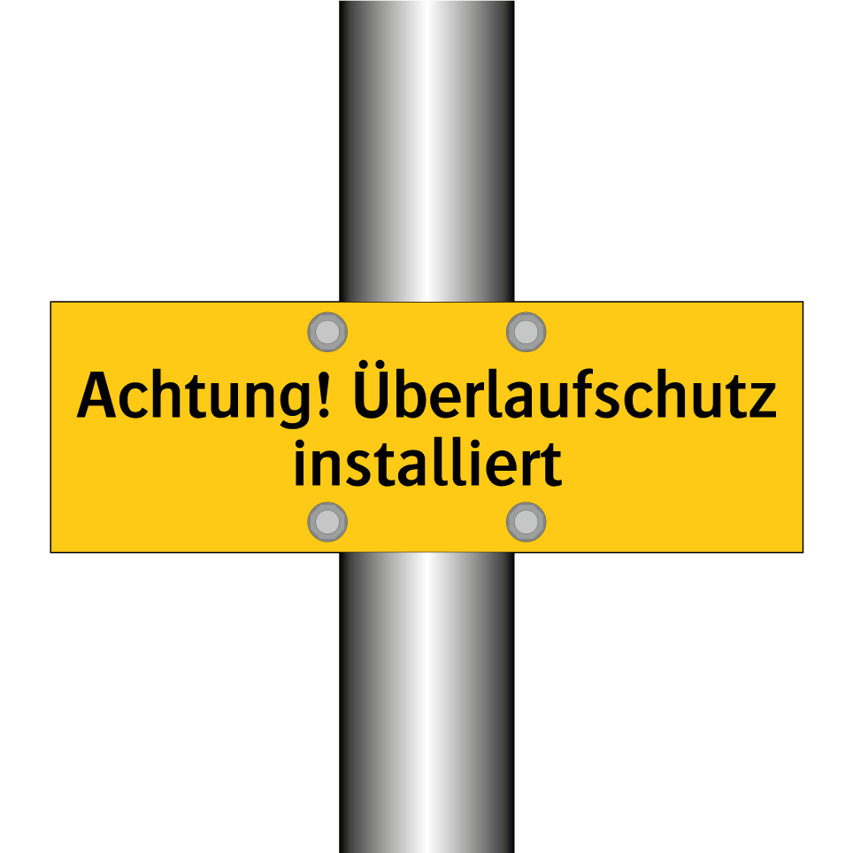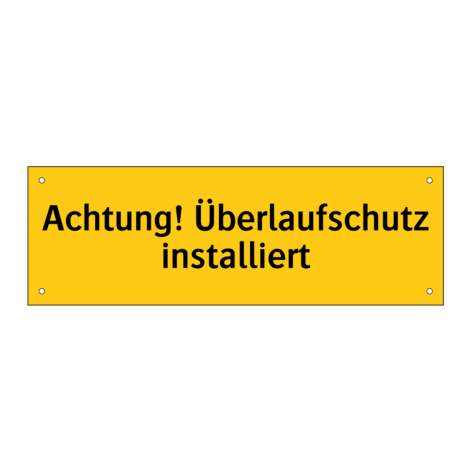 Warnschild mit dem Text Achtung! Überlaufschutz installiert
