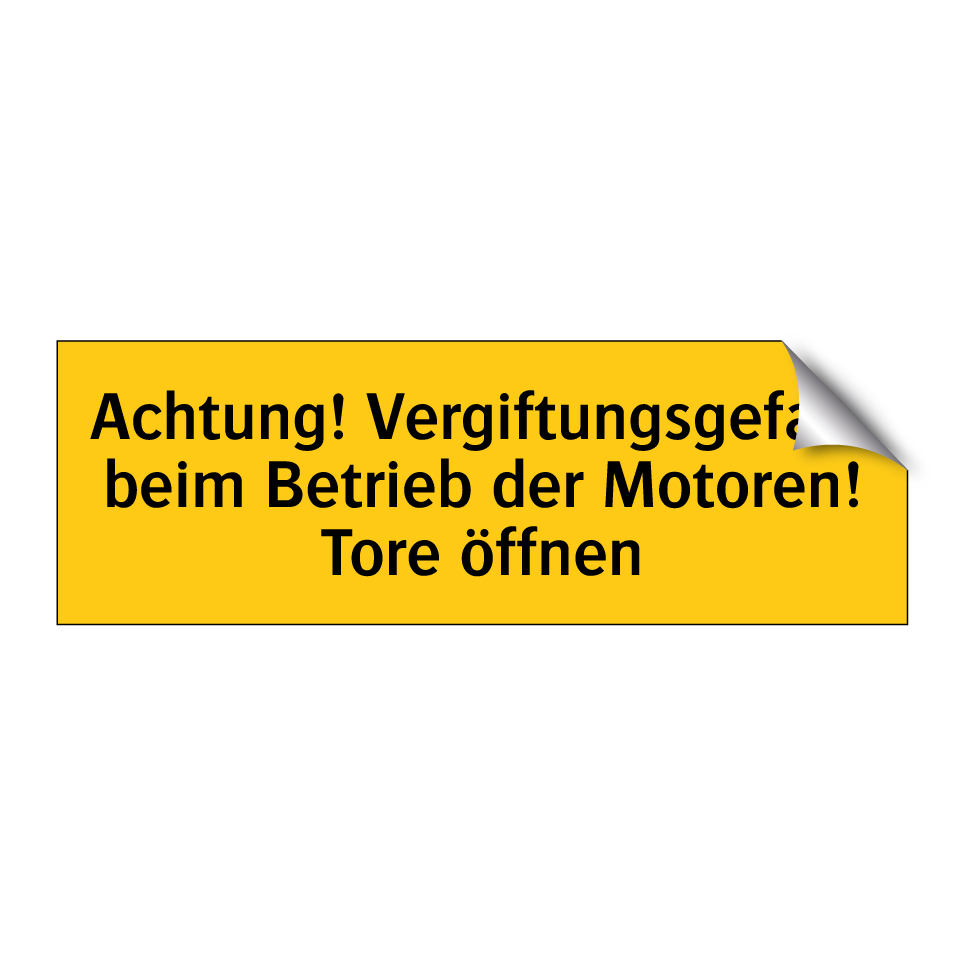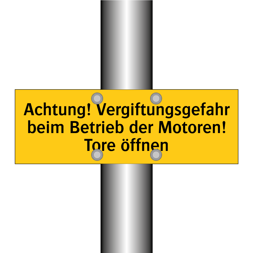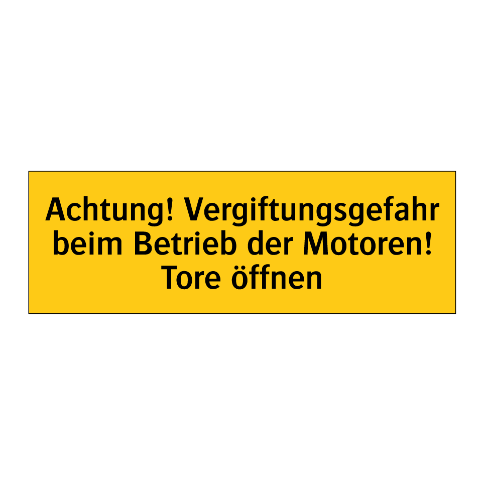 Warnschild mit dem Text Achtung! Vergiftungsgefahr beim Betrieb der Motoren! Tore öffnen