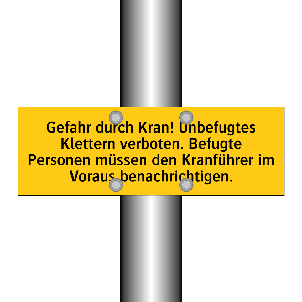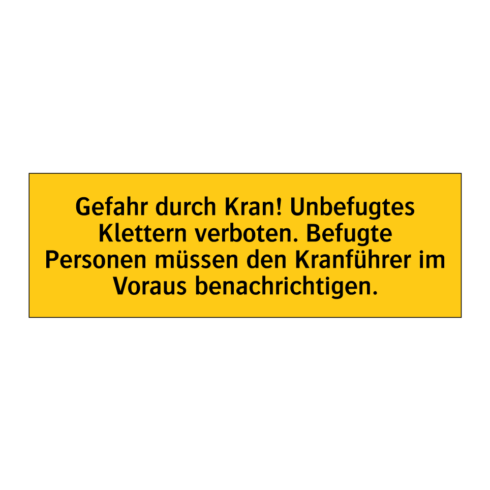Warnschild mit dem Text Gefahr durch Kran! Unbefugtes Klettern verboten. Befugte Personen müssen den Kranführer im Voraus benachrichtigen.