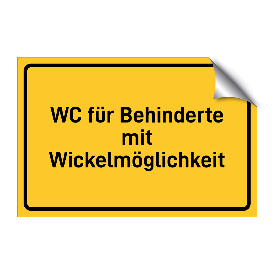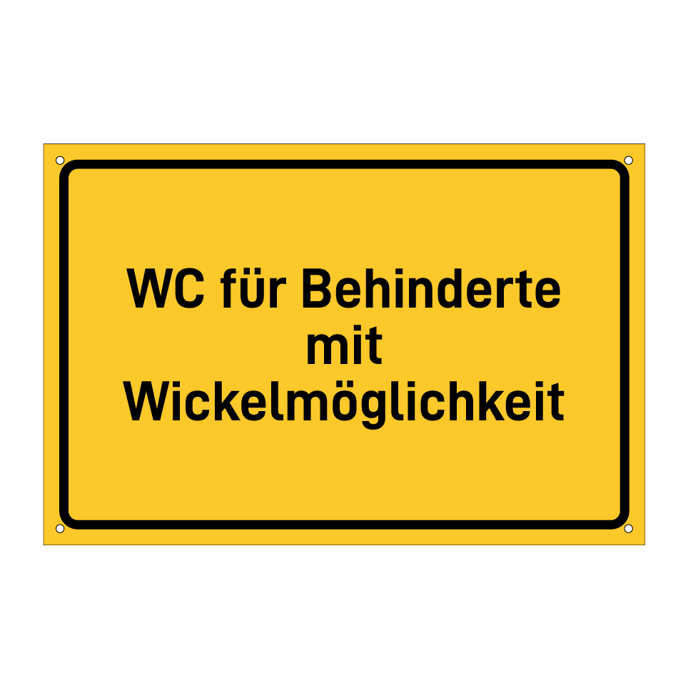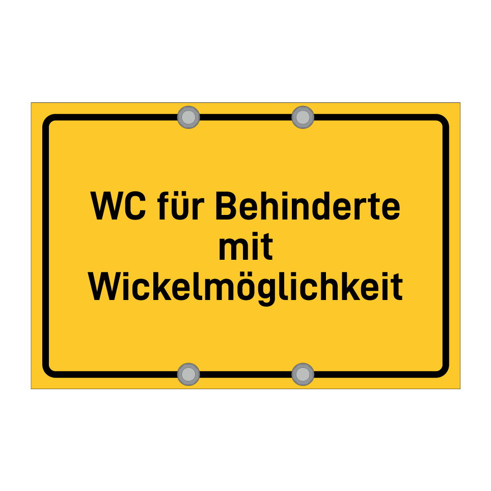 Hinweisschild mit dem Text WC für Behinderte mit Wickelmöglichkeit