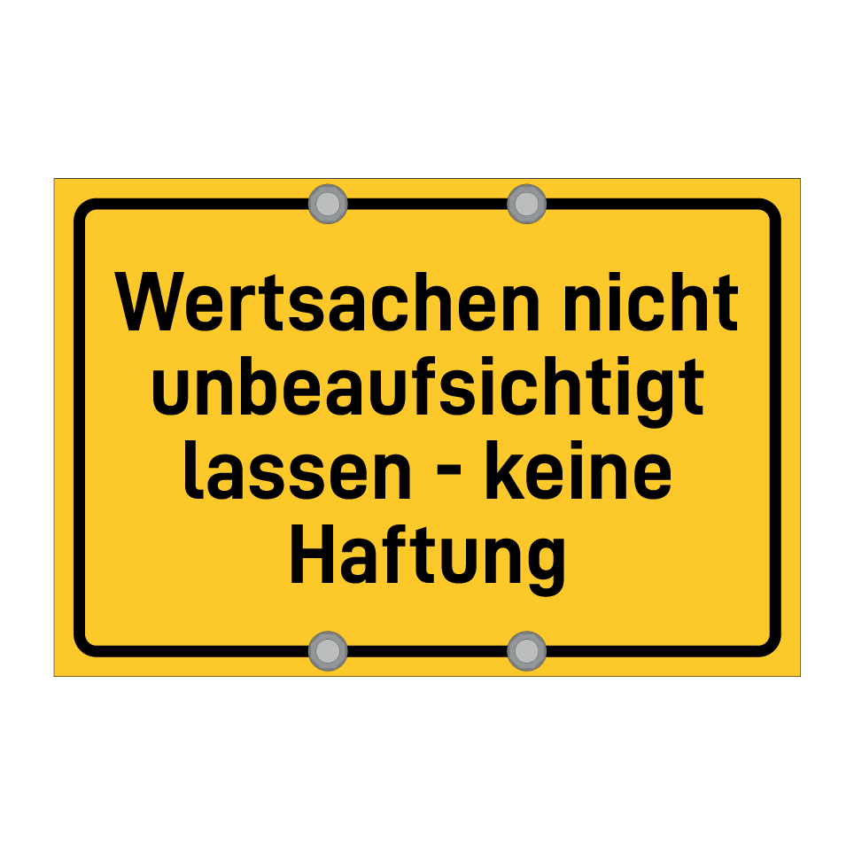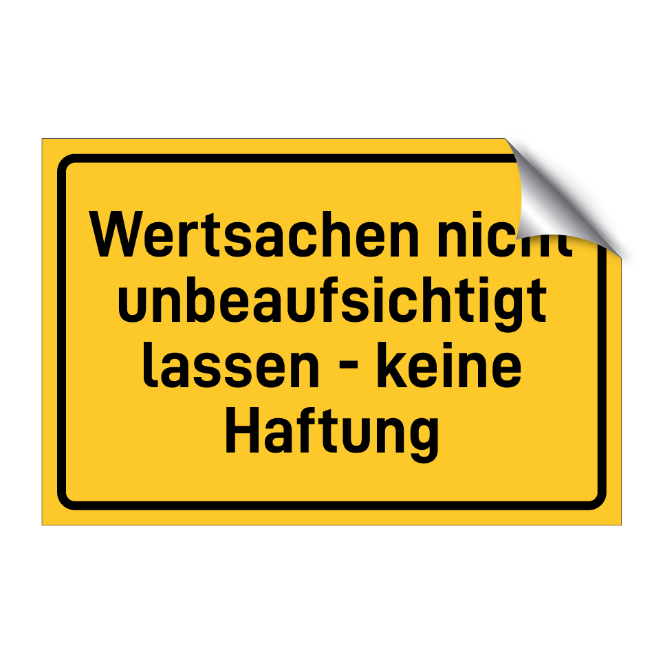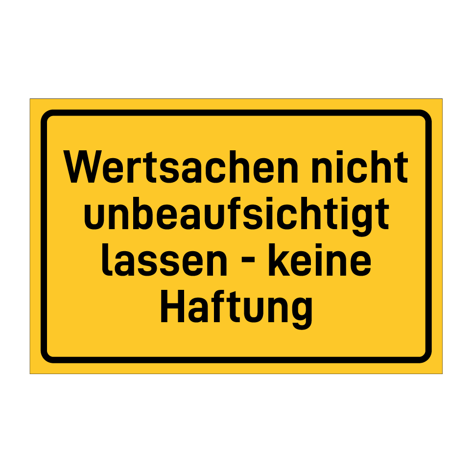 Hinweisschild mit dem Text Wertsachen nicht unbeaufsichtigt lassen - keine Haftung