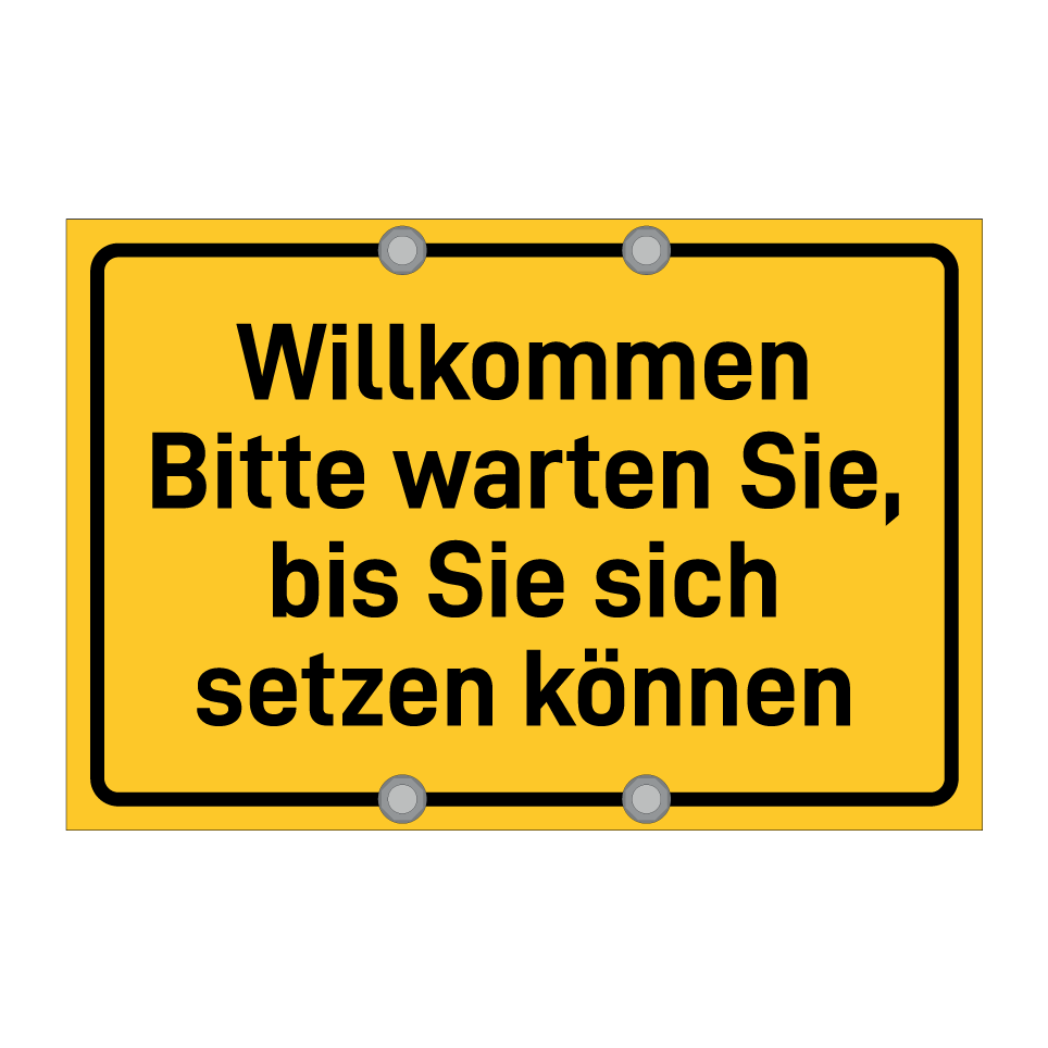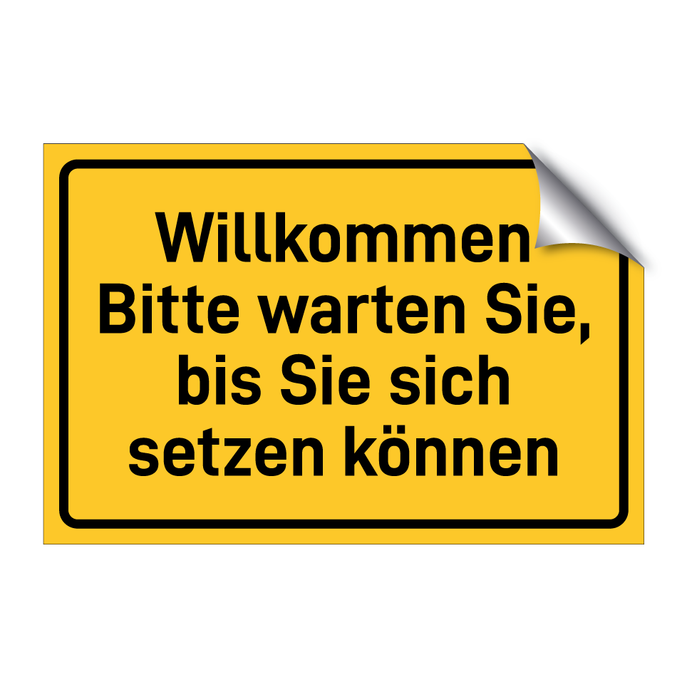 Hinweisschild mit dem Text Willkommen Bitte warten Sie, bis Sie sich setzen können